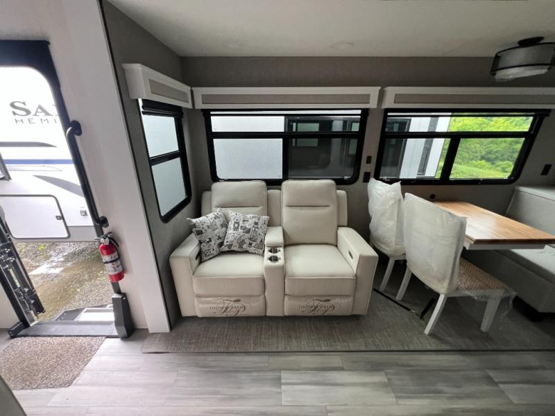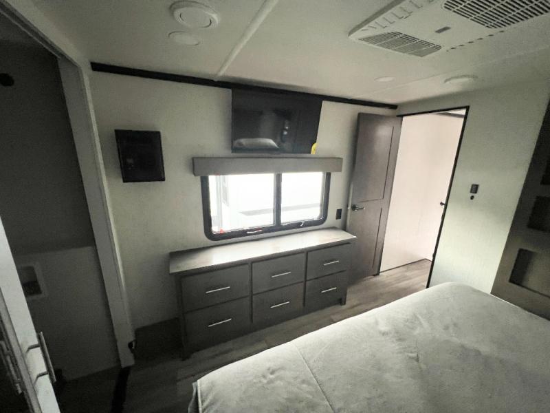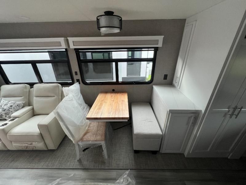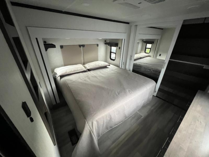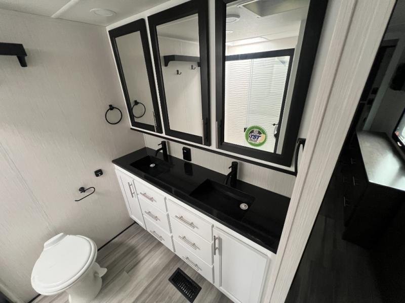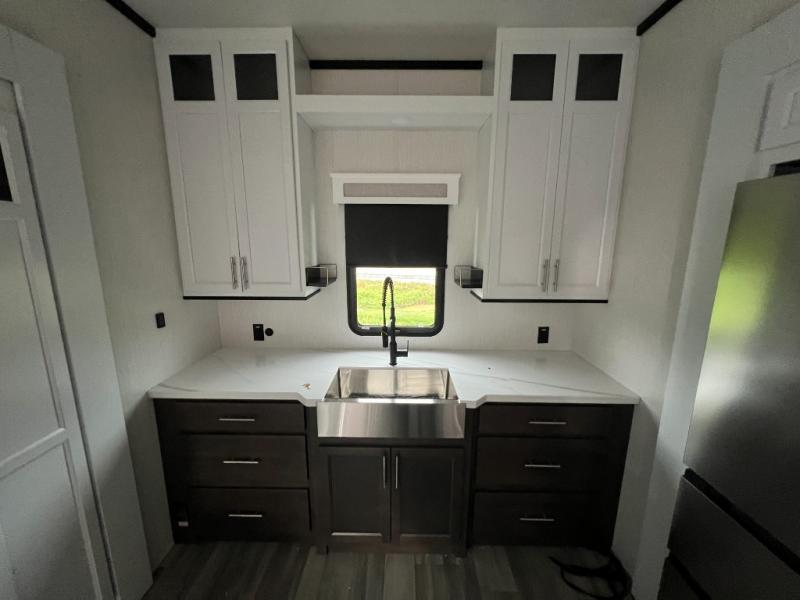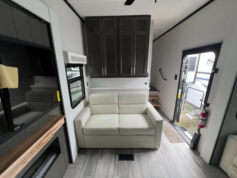 It will feel like coming home each time you take this fifth wheel out! The dual opposing slides in the main living area make your space open, and the waterfall island with two stools will be the perfect place to prep meals, dine together, or set out snacks for movie night! You will also love the rear counter space with a large sink to clean up each day and there is a dishwasher option if you want the option to make the process even easier. A tri-fold sofa in the main living area will provide a place for a guest or two to sleep, and the Murphy pantry hidden behind the entertainment center and fireplace will keep snacks stocked up. The full bath includes a shower with a seat, dual bath sinks, plus a linen closet to keep towels tidy. What could make this fifth wheel better than a king bed slide out in the front bedroom?! How about a large wardrobe with washer/dryer prep, a dresser with a TV above, and overhead storage for belongings!