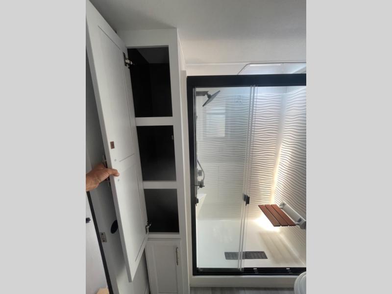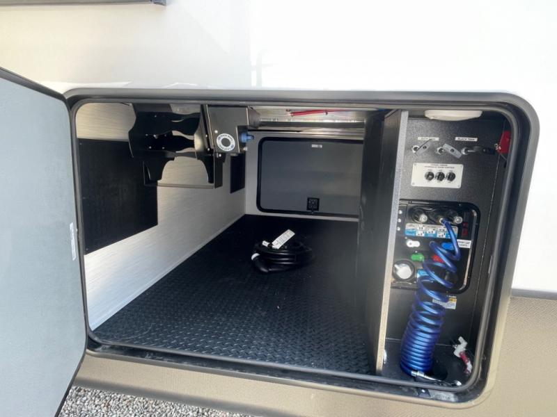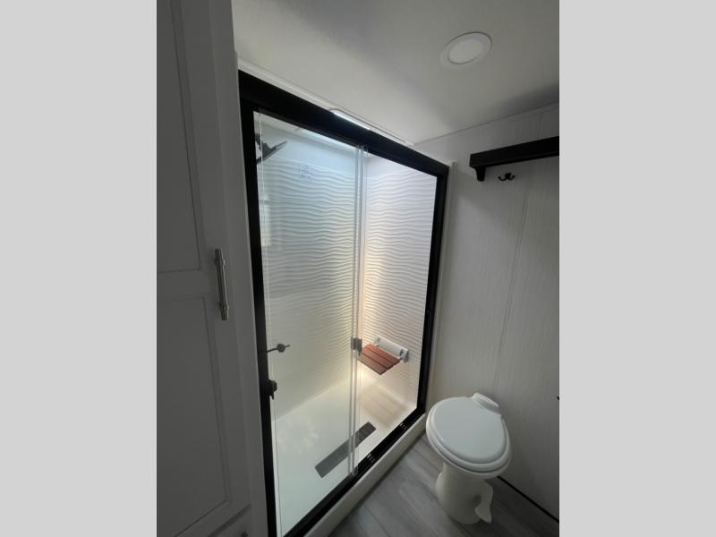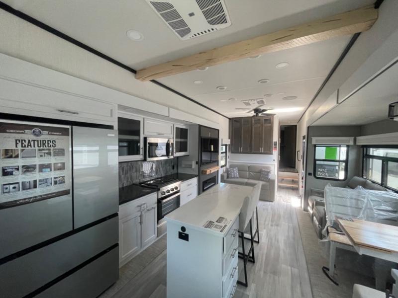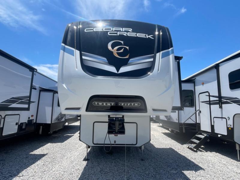 With any Cedar Creek fifth wheel by Forest River, you will find a quality-built RV with your comfort in mind! The all-aluminum super structure on 16" centers or less will provide a solid foundation to your fifth wheel, and the VIXENITE waterproof composite slide floors will hold up over years of use. Each model also includes black textured metal skirting, a TST tire pressure monitor system, and Cradlepoint Day 1 Wi-Fi connectivity so you can stay connected while you camp. A Lippert Gen 3 Leveling System makes setting up camp easier than ever, and the 200 watt solar panel means you can enjoy some off-grid capabilities. Head inside to find upgraded solid surface countertops, floating steps to the upper deck, USB ports, and updated backsplash that is modern and eye-catching. You will also enjoy new in-wall storage in the bedroom for books or personal belongings, a new V-Flo cordless vacuum for easy clean up, a redesigned shower with LED lighting and a fold-down bench, and many more luxuries!