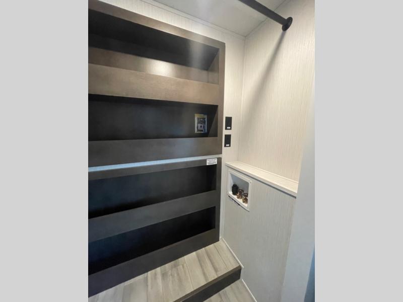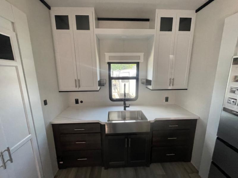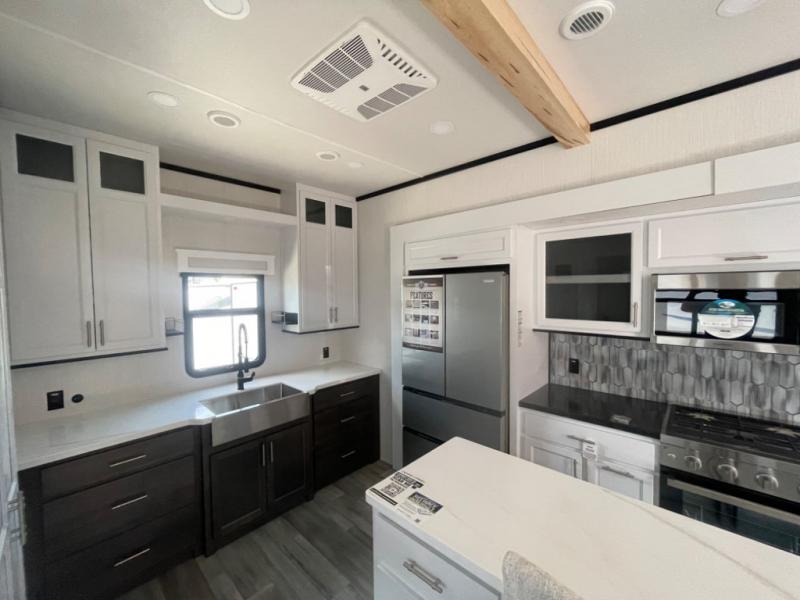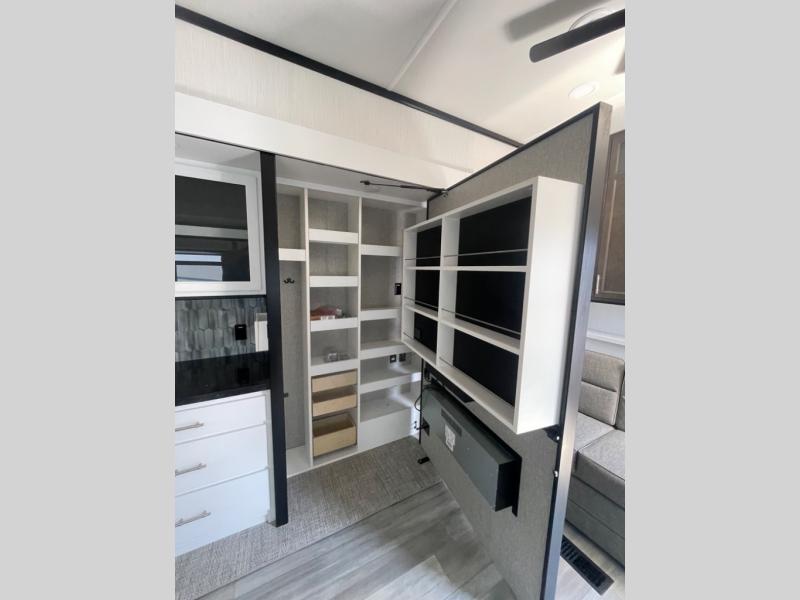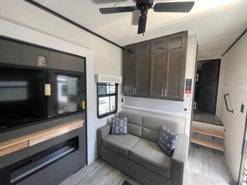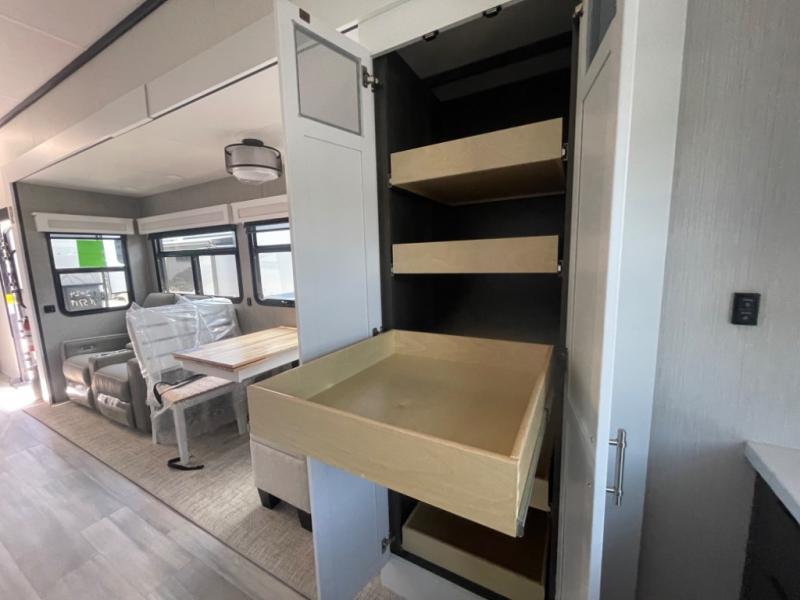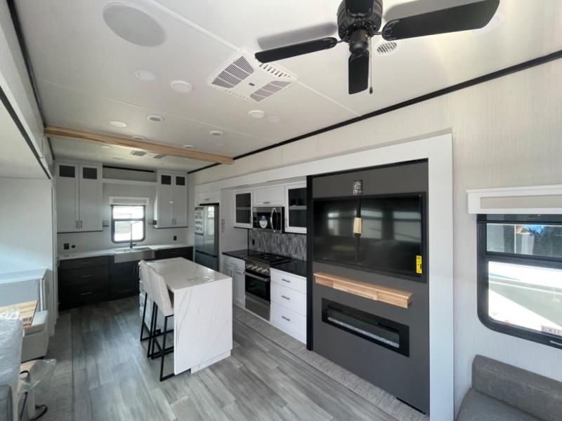 It will feel like coming home each time you take this fifth wheel out! The dual opposing slides in the main living area make your space open, and the waterfall island with two stools will be the perfect place to prep meals, dine together, or set out snacks for movie night! You will also love the rear counter space with a large sink to clean up each day and there is a dishwasher option if you want the option to make the process even easier. A tri-fold sofa in the main living area will provide a place for a guest or two to sleep, and the Murphy pantry hidden behind the entertainment center and fireplace will keep snacks stocked up. The full bath includes a shower with a seat, dual bath sinks, plus a linen closet to keep towels tidy. What could make this fifth wheel better than a king bed slide out in the front bedroom?! How about a large wardrobe with washer/dryer prep, a dresser with a TV above, and overhead storage for belongings!