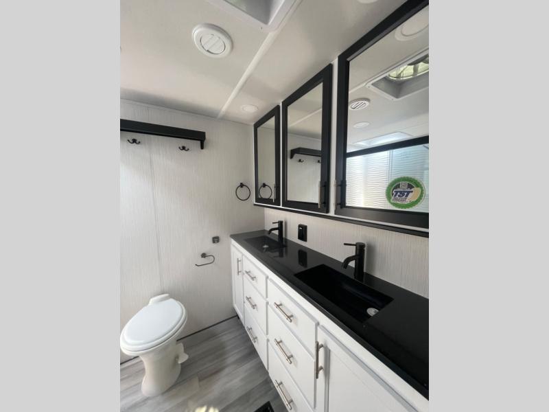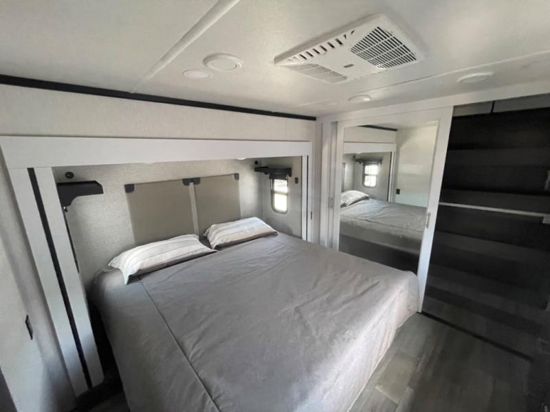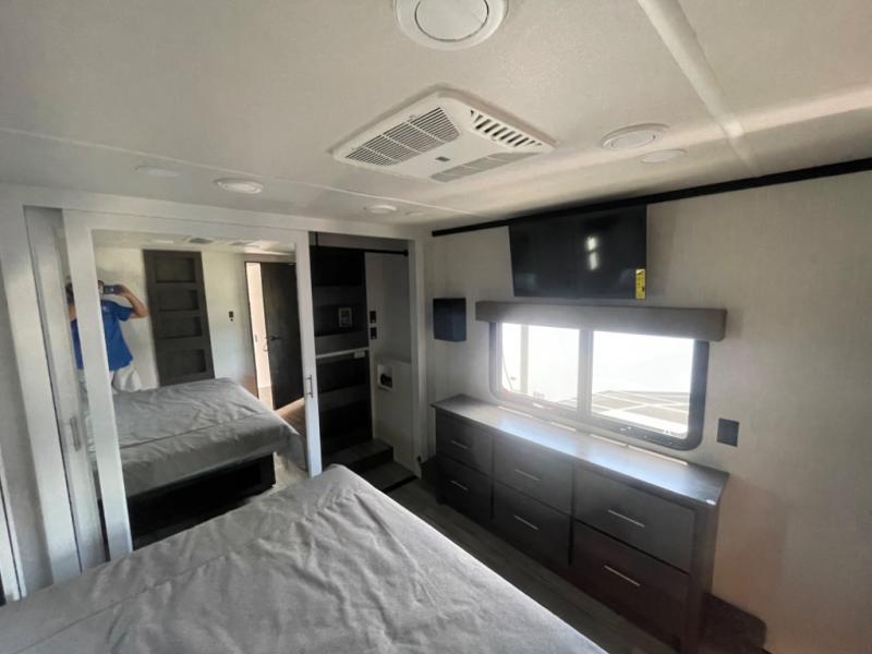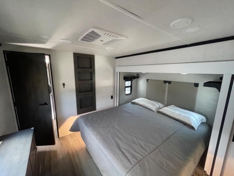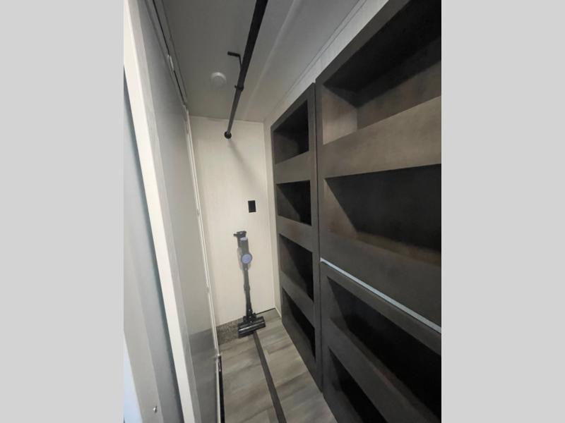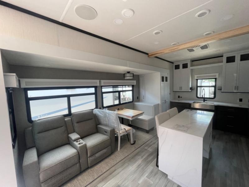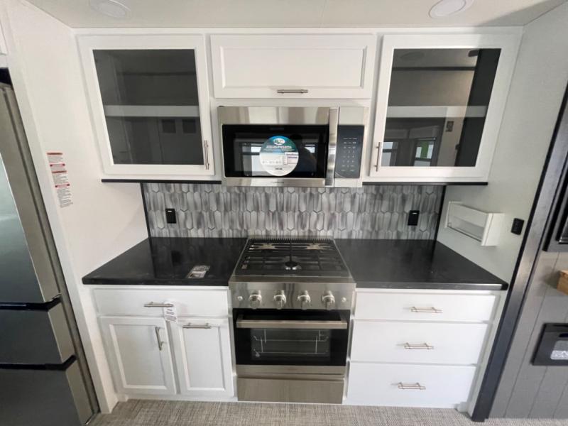 It will feel like coming home each time you take this fifth wheel out! The dual opposing slides in the main living area make your space open, and the waterfall island with two stools will be the perfect place to prep meals, dine together, or set out snacks for movie night! You will also love the rear counter space with a large sink to clean up each day and there is a dishwasher option if you want the option to make the process even easier. A tri-fold sofa in the main living area will provide a place for a guest or two to sleep, and the Murphy pantry hidden behind the entertainment center and fireplace will keep snacks stocked up. The full bath includes a shower with a seat, dual bath sinks, plus a linen closet to keep towels tidy. What could make this fifth wheel better than a king bed slide out in the front bedroom?! How about a large wardrobe with washer/dryer prep, a dresser with a TV above, and overhead storage for belongings!