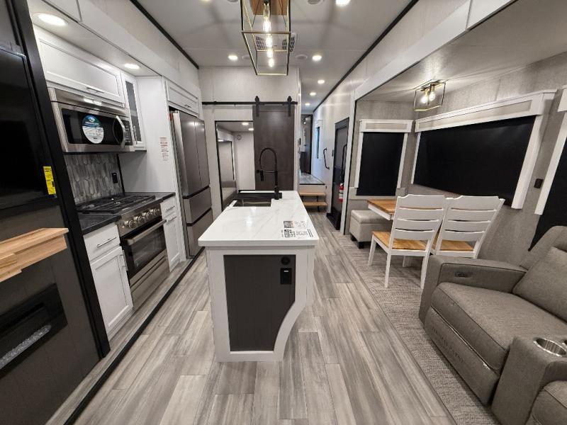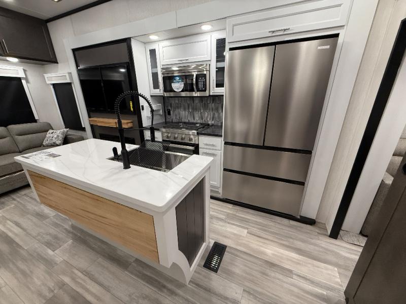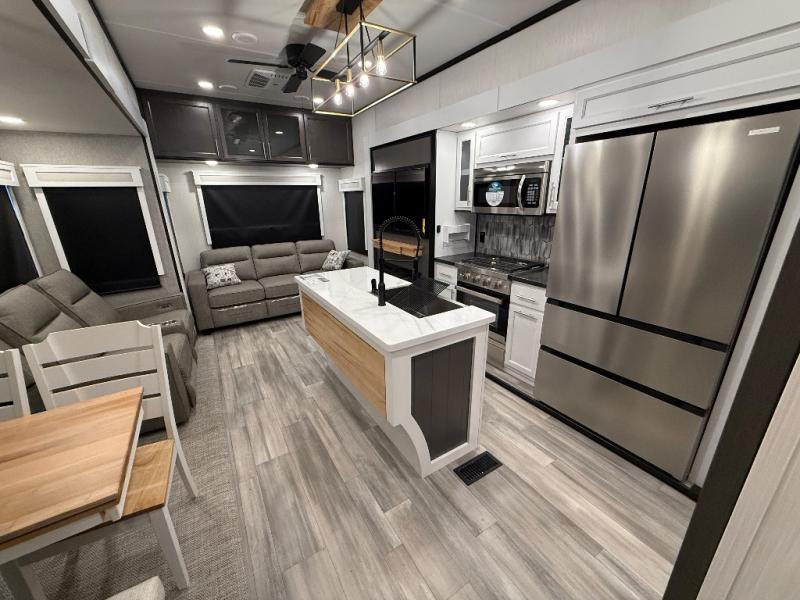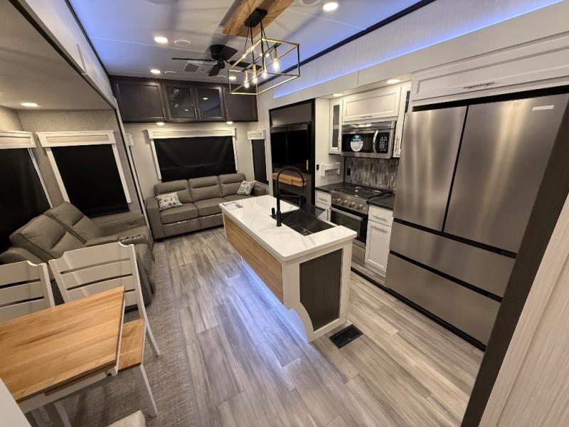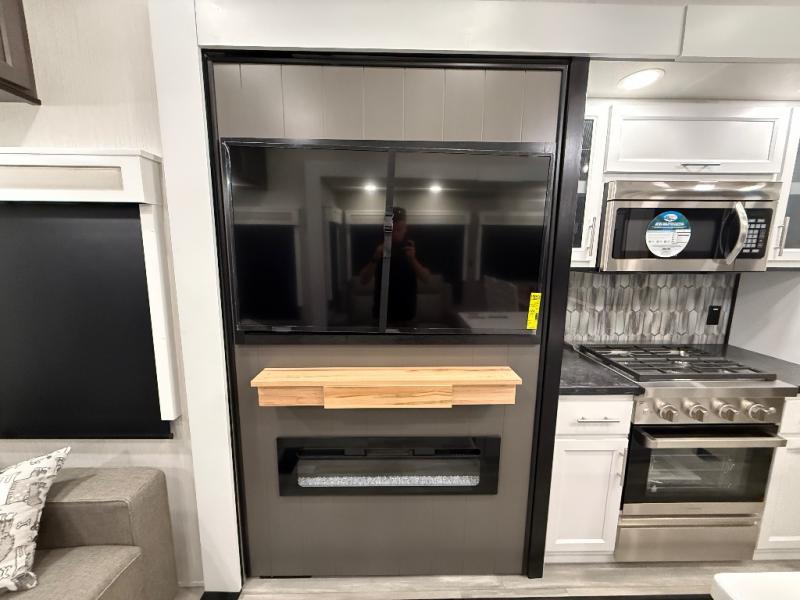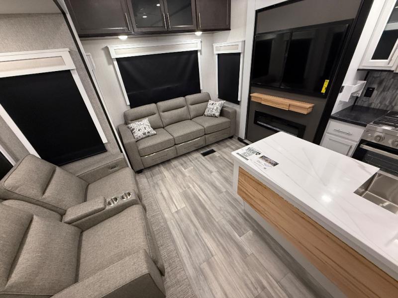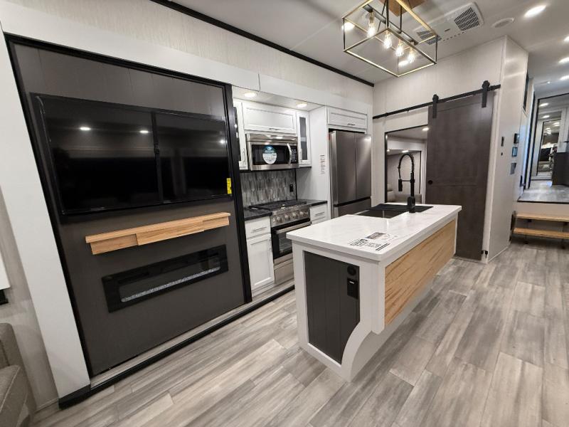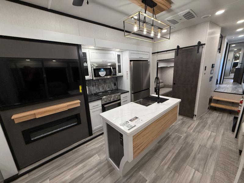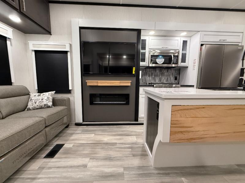 With two bedrooms in this fifth wheel, the whole family can camp together! The front private bedroom has a king bed slide to lay your head at night, a dresser with a TV, and a front wardrobe with storage shelves to keep your clothes looking nice. The second bedroom has a 91" x 64- 3/4" loft above a tri-fold sofa slide that is across from the TV and wardrobe, and you could even switch out the sofa for an optional 73" desk to get some work done while you are away. Everyone can freshen up in the full bathroom with a shower with a seat and their bellies full with a kitchen island and 20 cu. ft. 12V refrigerator . After a day in the sun, head to the rear living area and relax on either the hide-a-bed sofa or the power theater seating across from the fireplace and swivel mounted TV. You will also love the hidden Murphy pantry behind the TV for smart storage solutions!
