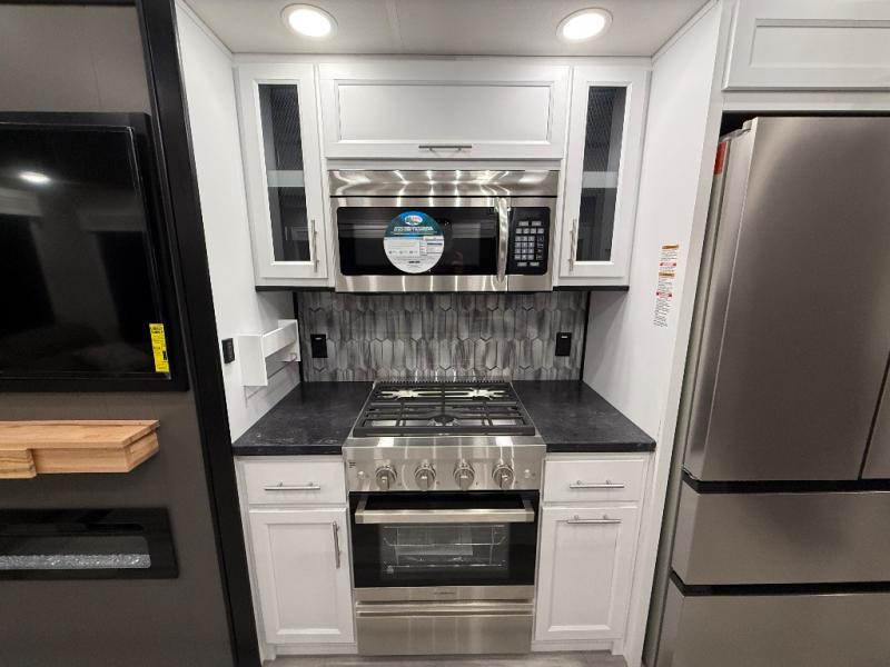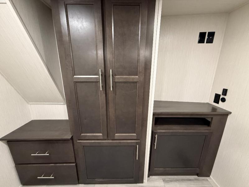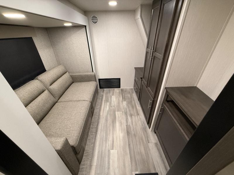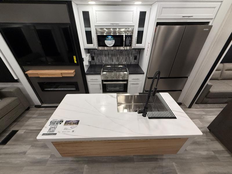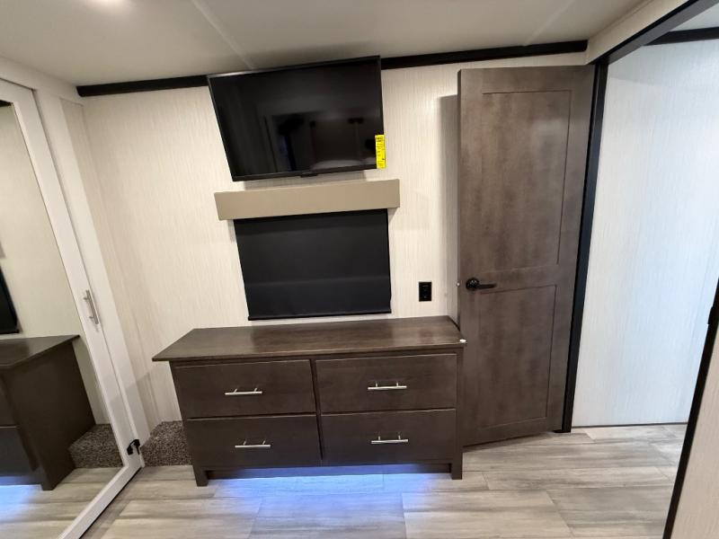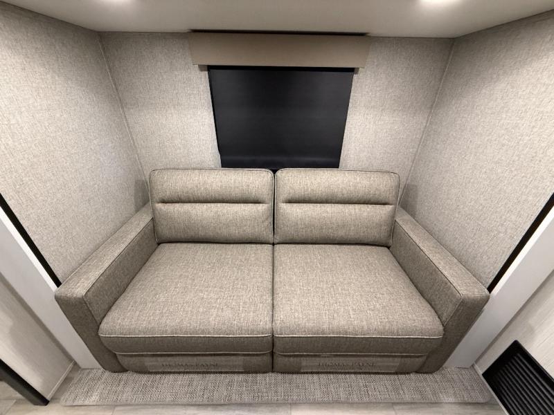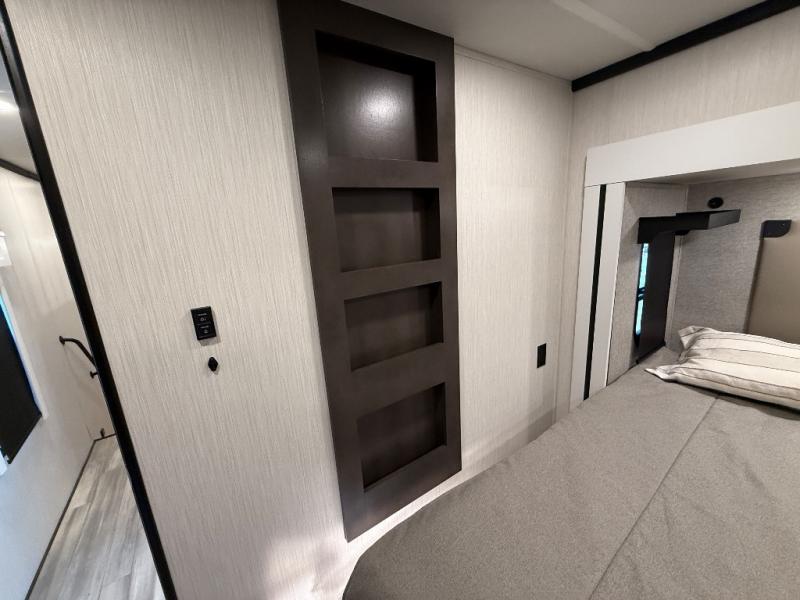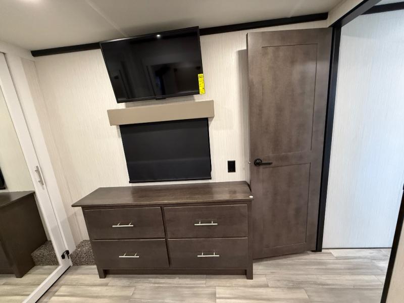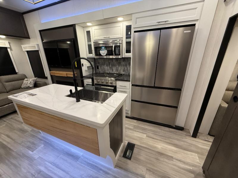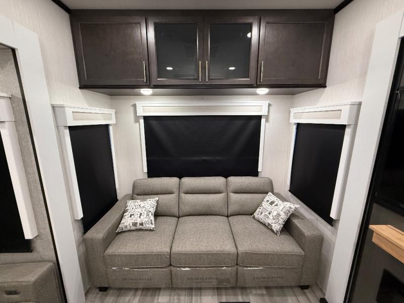 With two bedrooms in this fifth wheel, the whole family can camp together! The front private bedroom has a king bed slide to lay your head at night, a dresser with a TV, and a front wardrobe with storage shelves to keep your clothes looking nice. The second bedroom has a 91" x 64- 3/4" loft above a tri-fold sofa slide that is across from the TV and wardrobe, and you could even switch out the sofa for an optional 73" desk to get some work done while you are away. Everyone can freshen up in the full bathroom with a shower with a seat and their bellies full with a kitchen island and 20 cu. ft. 12V refrigerator . After a day in the sun, head to the rear living area and relax on either the hide-a-bed sofa or the power theater seating across from the fireplace and swivel mounted TV. You will also love the hidden Murphy pantry behind the TV for smart storage solutions!