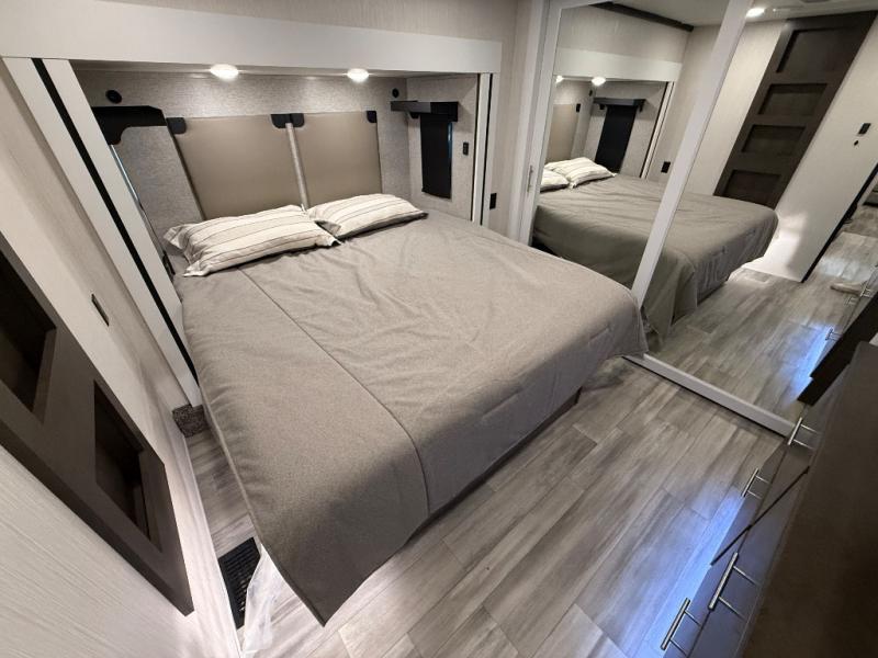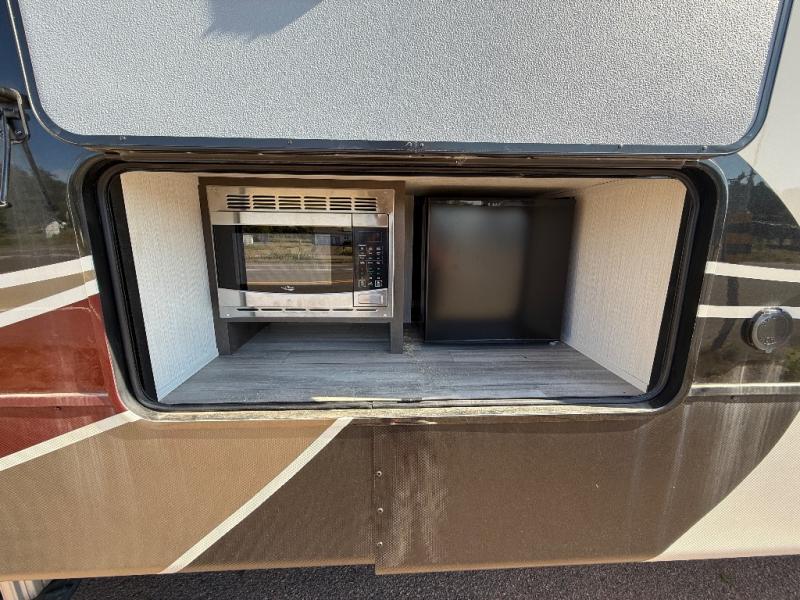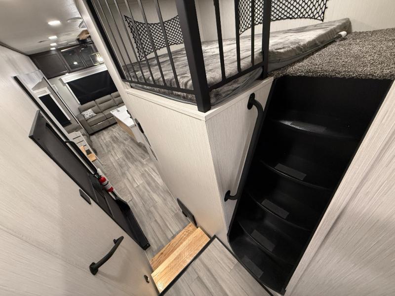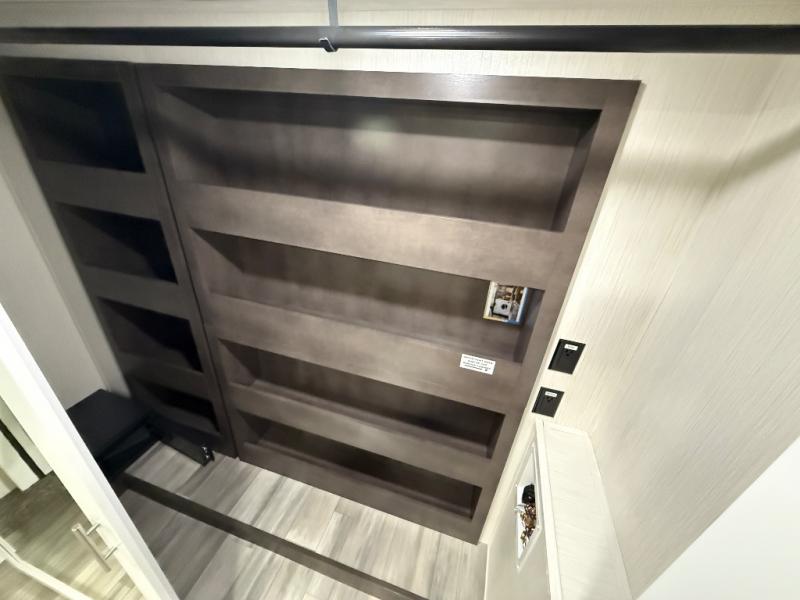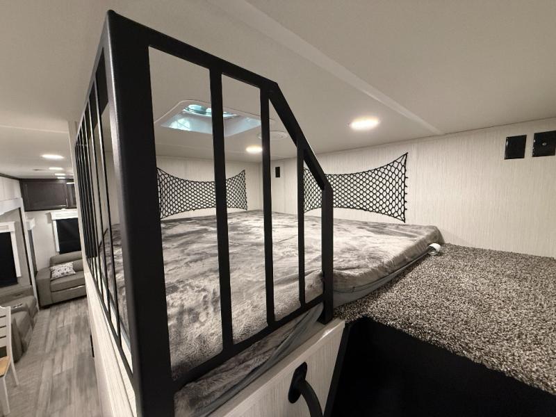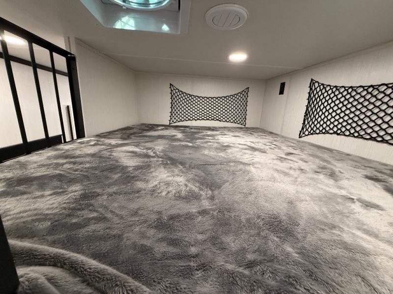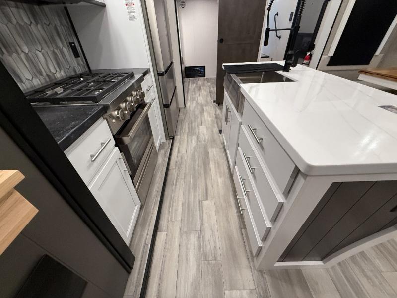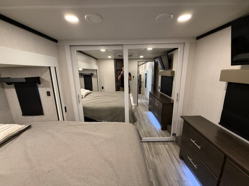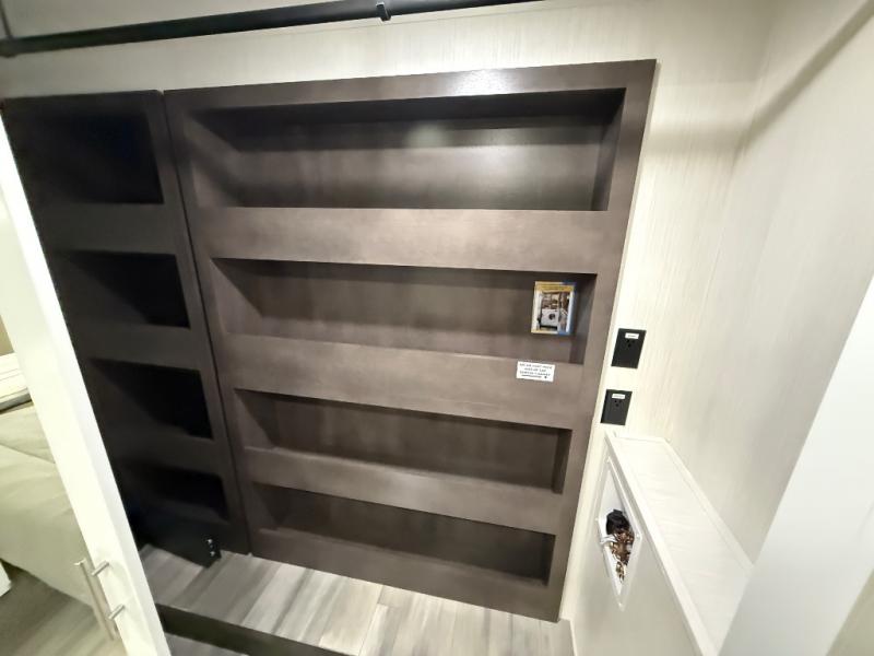 With two bedrooms in this fifth wheel, the whole family can camp together! The front private bedroom has a king bed slide to lay your head at night, a dresser with a TV, and a front wardrobe with storage shelves to keep your clothes looking nice. The second bedroom has a 91" x 64- 3/4" loft above a tri-fold sofa slide that is across from the TV and wardrobe, and you could even switch out the sofa for an optional 73" desk to get some work done while you are away. Everyone can freshen up in the full bathroom with a shower with a seat and their bellies full with a kitchen island and 20 cu. ft. 12V refrigerator . After a day in the sun, head to the rear living area and relax on either the hide-a-bed sofa or the power theater seating across from the fireplace and swivel mounted TV. You will also love the hidden Murphy pantry behind the TV for smart storage solutions!