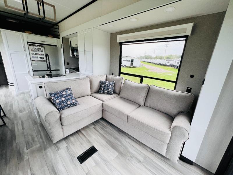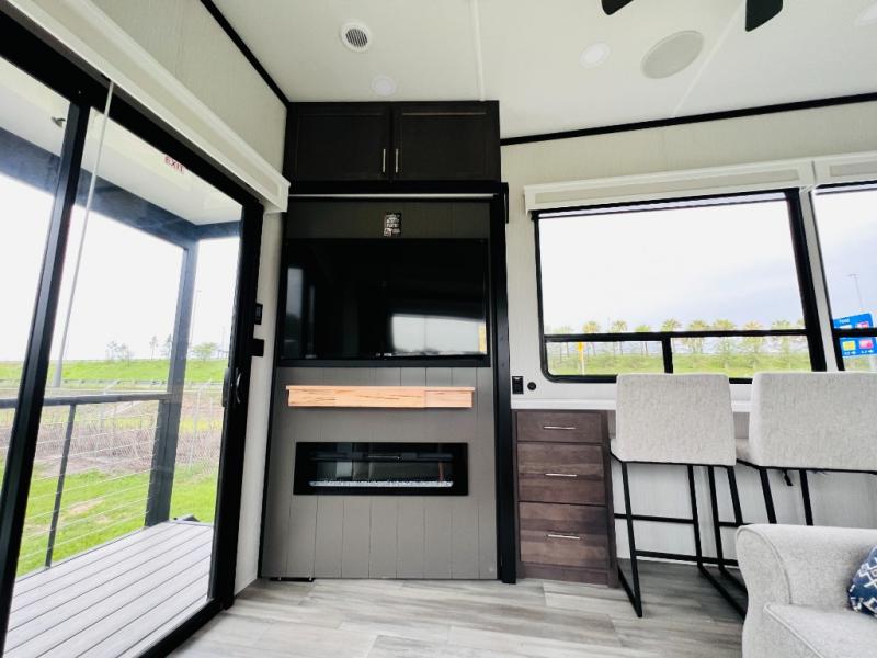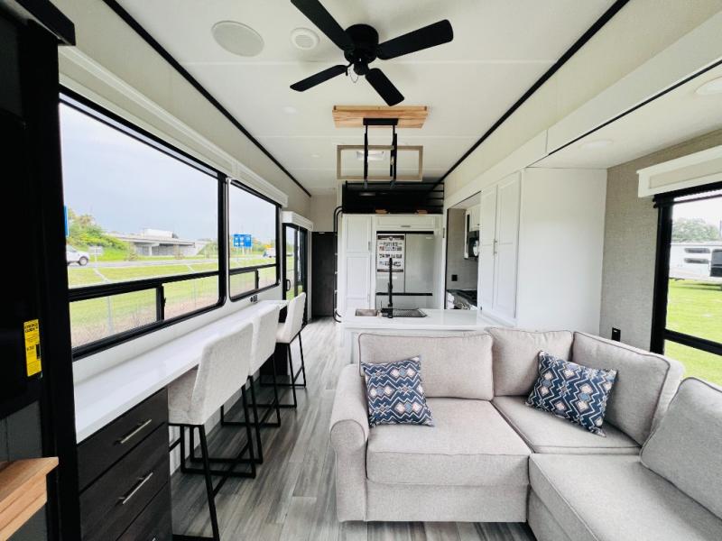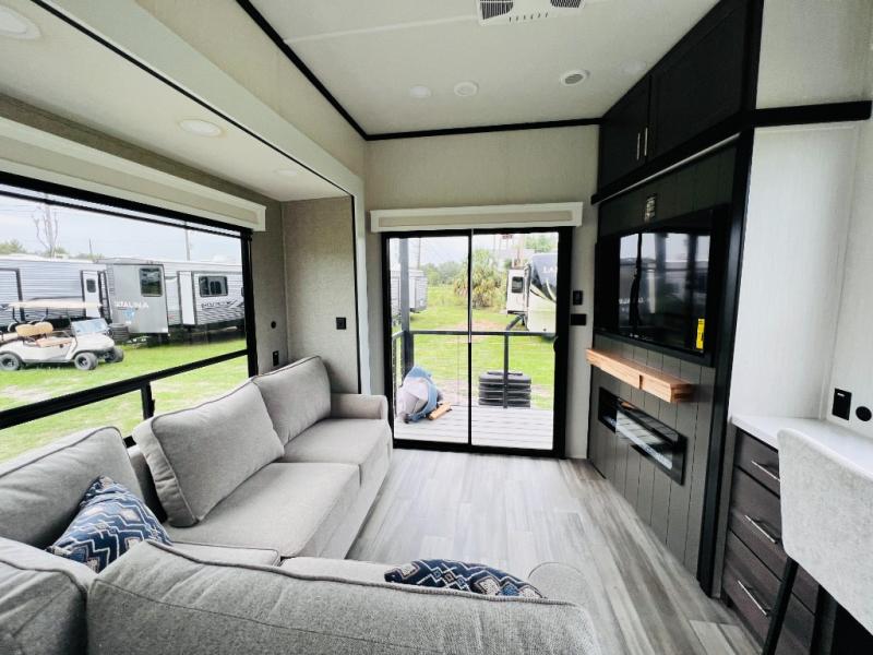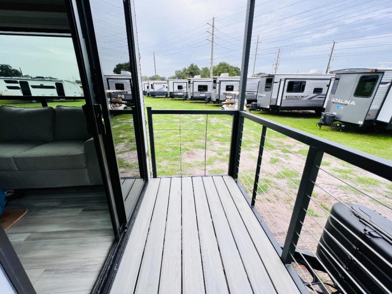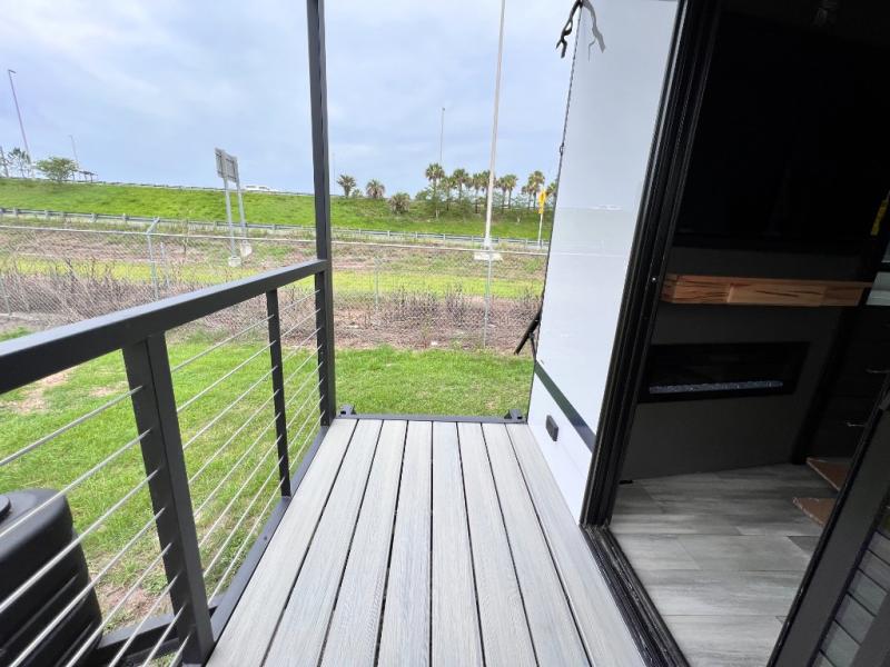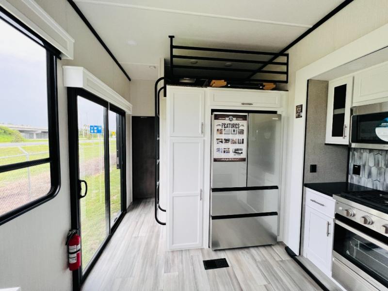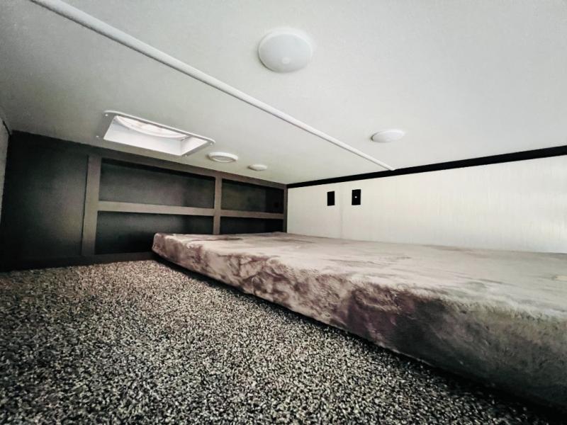 If you need more sleeping or storage space, this destination trailer is the one for you! There is a front covered porch with sliding glass doors that enters in to the front living area. Here, you'll enjoy relaxing on the sectional hide-a-bed sofa across from the entertainment center and fireplace. The spacious bar top with two seats will provide a place to dine, and the middle kitchen is any chef's dream with its two pantries, spacious 20 cu. ft. 12V refrigerator, and plenty of counter space! When you're ready for your own space, you can retreat to the rear bedroom where you'll find a king bed slide out, a wardrobe, a dresser, drawers, and even washer and dryer prep. The comfort doesn't stop there! There is also a loft above the full bath that includes a ladder and a mattress, so you can use this space for more sleeping or storage space!
