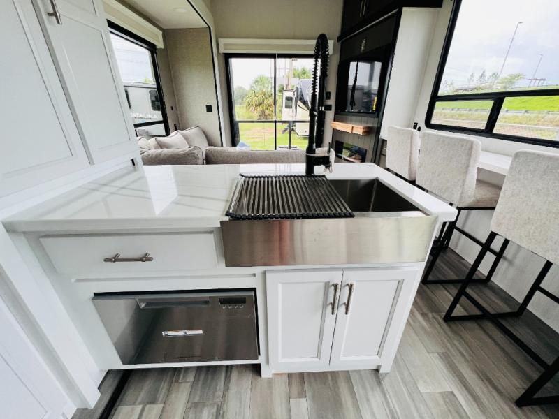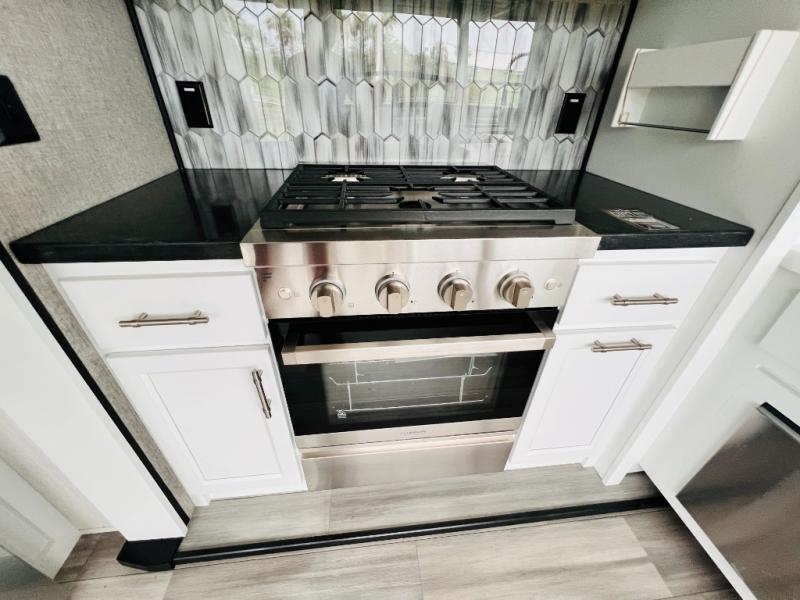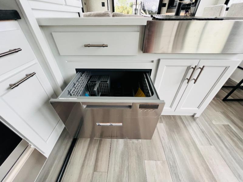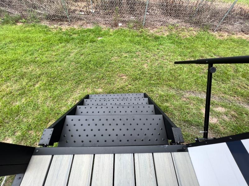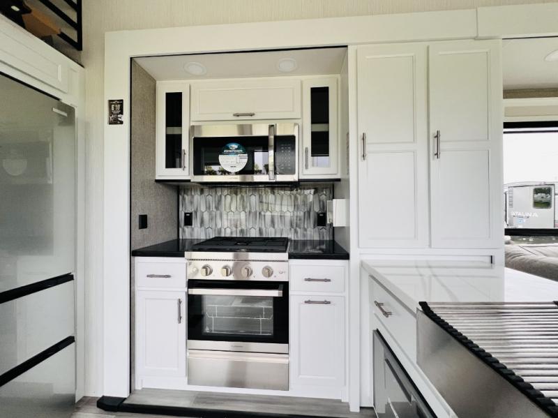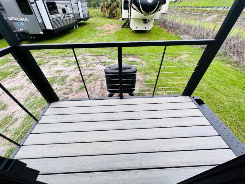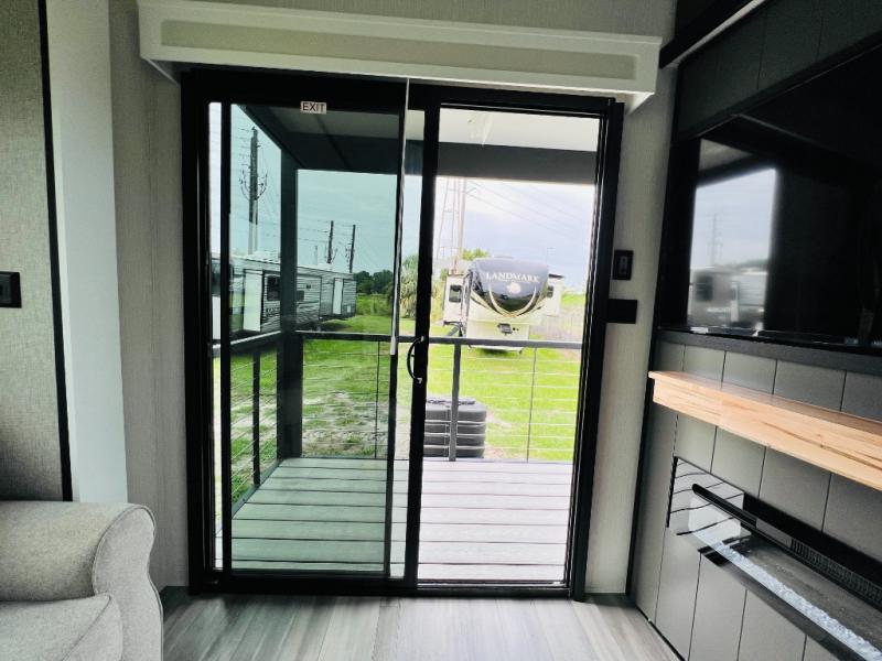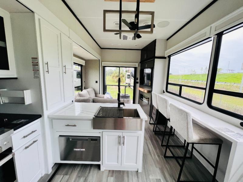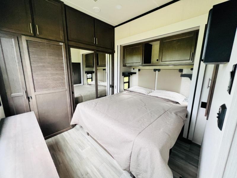 If you need more sleeping or storage space, this destination trailer is the one for you! There is a front covered porch with sliding glass doors that enters in to the front living area. Here, you'll enjoy relaxing on the sectional hide-a-bed sofa across from the entertainment center and fireplace. The spacious bar top with two seats will provide a place to dine, and the middle kitchen is any chef's dream with its two pantries, spacious 20 cu. ft. 12V refrigerator, and plenty of counter space! When you're ready for your own space, you can retreat to the rear bedroom where you'll find a king bed slide out, a wardrobe, a dresser, drawers, and even washer and dryer prep. The comfort doesn't stop there! There is also a loft above the full bath that includes a ladder and a mattress, so you can use this space for more sleeping or storage space!