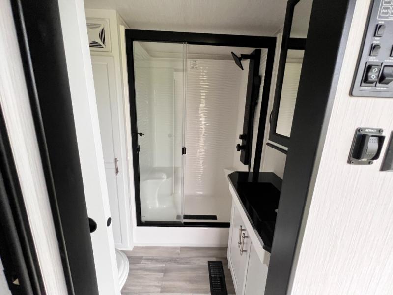 Each time you visit your favorite camping destination, you'll be so grateful to find the Forest River Cedar Creek Cottage destination trailer waiting for you! The exterior has ABS removable underbelly panels, a decorative front cap with a molded picket fence, an electric awning with LED night lighting, and a full, walk-on roof for added durability. The dual-pane patio door will allow you to see the beautiful outside scenery from the comfort of indoors, and the 8' 5" wide body will give your crew plenty of space to stretch out and relax. There are also vinyl floor coverings inside, along with solid surface countertops with stainless steel apron sinks, USB ports in the kitchen and bedroom, plus a spacious shower with a seat and sliding glass doors for added luxury.
