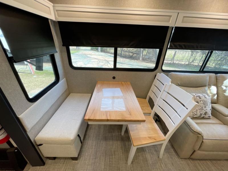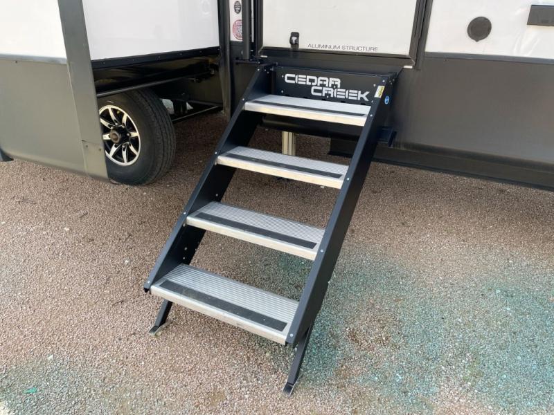 With any Cedar Creek Experience fifth wheel by Forest River, you will bet met with luxury features both inside and out! The True Gelcoat exterior is the best of the best in exteriors and the 3M bonded sidewalls will hold up over years of use. Each model includes Lippert 7,000 lb. axles with ABS brakes, Road Warrior suspension, plus TST tire pressure monitoring system to make towing that much easier. You will also find a 200 watt solar panel outside, along with a heated front storage compartment, a Nautilus P4 multi-function panel with an outside shower, black tank flush, and 12V battery disconnect, plus many more exterior conveniences. The interior will have you feeling like you haven't left home with vinyl floor coverings, Ashley furniture power theater seating, a cozy fireplace, a large bath counter, and the list of comforts goes on! Each model is also pre-wired for satellite to the roof, and you're sure to never go bored with a Smart TV in the living room and an added bedroom TV!