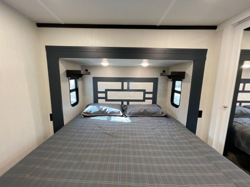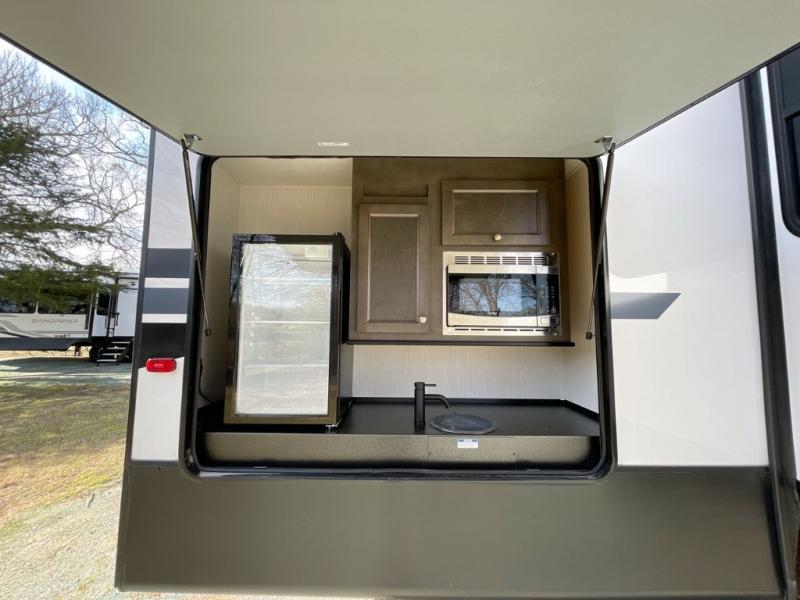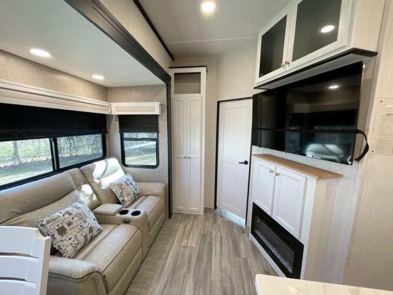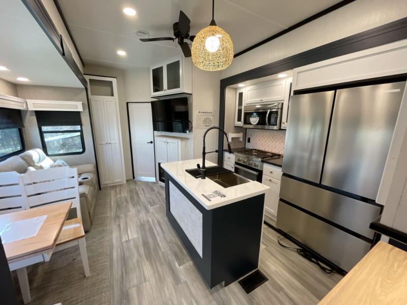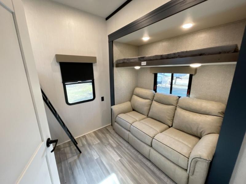 If you have a large group, this Cedar Creek Experience fifth wheel is for you. A rear bunk room offers tons of flexibility, with an upper bunks above a sofa on one side and a TV/drawer unit on the other. At the opposite end you have a private front bedroom with king bed, dresser, TV, and a sliding door closet that includes shelving and washer/dryer prep. A central kitchen is as nice as the one at home, with a 20 cu. ft. 12V 4-door refrigerator, a three burner cooktop, and a stainless steel 30" over-the-range microwave. There is also a center island with a large sink for easy clean up. You'll love to relax by the fireplace on the power theater seats, where you can watch either the TV or the fireplace - or both! Outside you'll find even more amenities including a 15' awning plus an outdoor refrigerator and microwave!