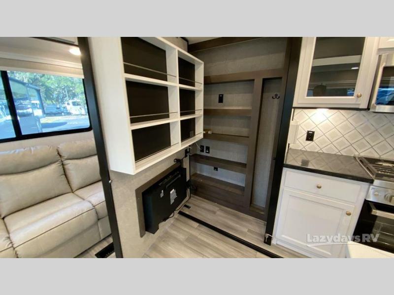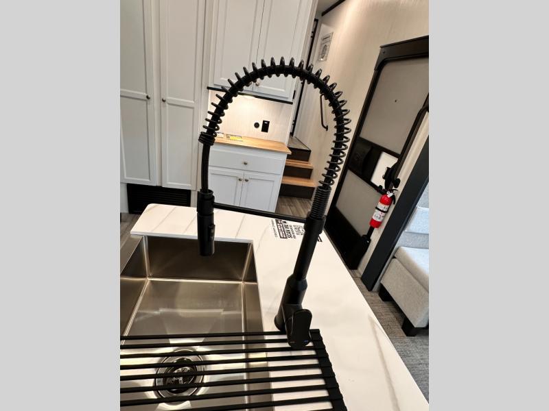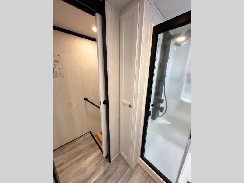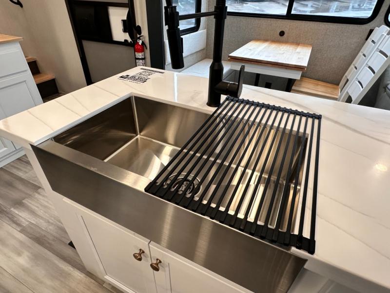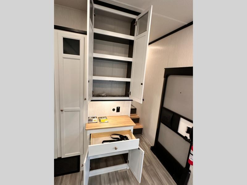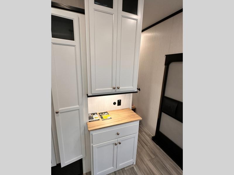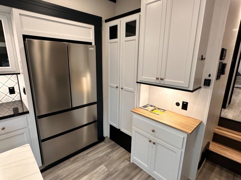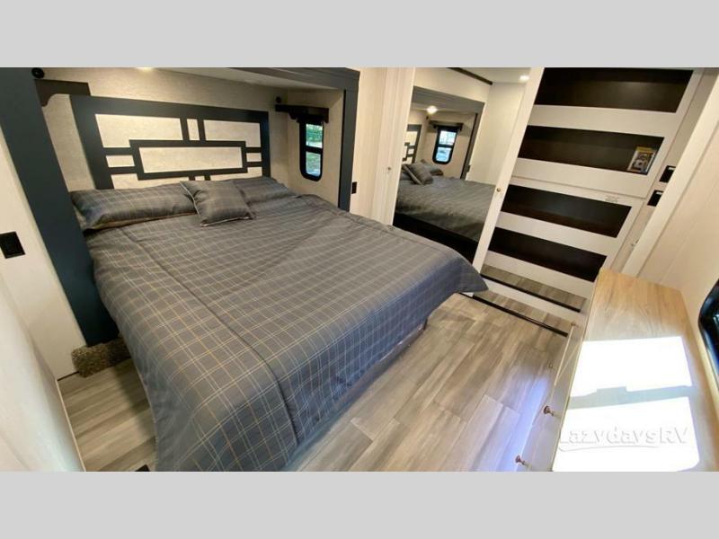 There's plenty of room to spread out and relax in this Cedar Creek Experience fifth wheel. A spacious living area includes a hide-a-bed sofa and dual power theater seats, so there's always a great angle to watch TV. Slides on either side give you a roomy feel, especially for the kitchen area, and there is even a Murphy pantry hidden behind the entertainment center. You'll appreciate cooking in this space with so many amenities, like a kitchen island with a large sink, a second pantry, and overhead cabinets for even more storage. Later you can retire to the private front bedroom with its king bed which is located in the third slide for even more room to walk around. And there's additional storage here, with a dresser and a front wardrobe with shelves and washer/dryer prep. A linen closet in the bathroom provides a place for all your sheets and towels.