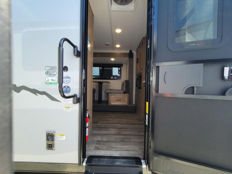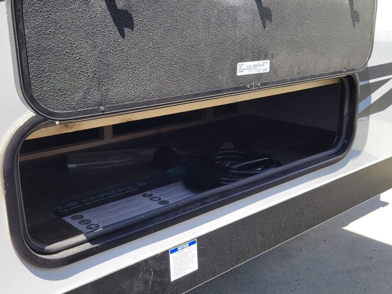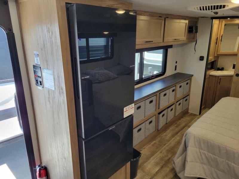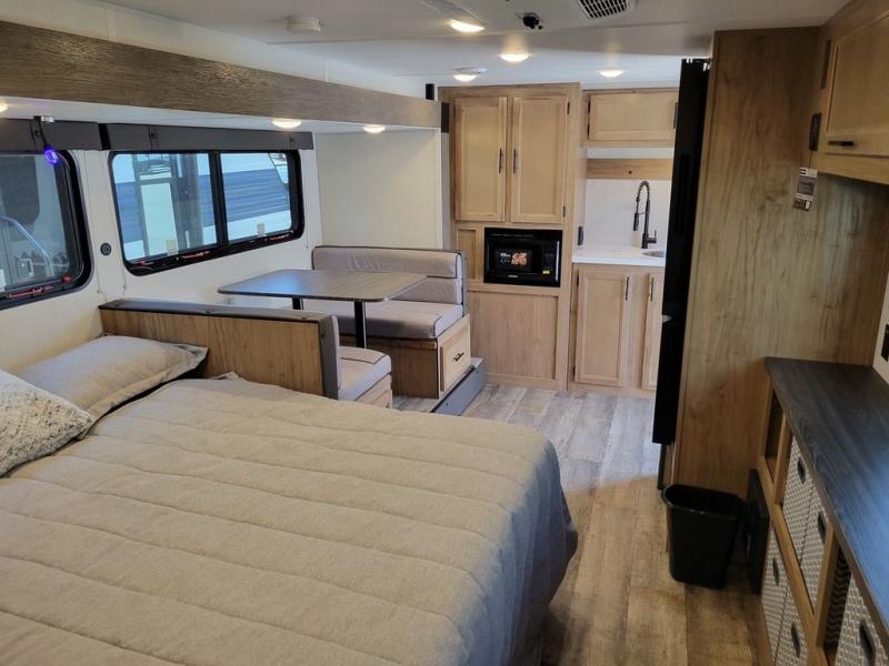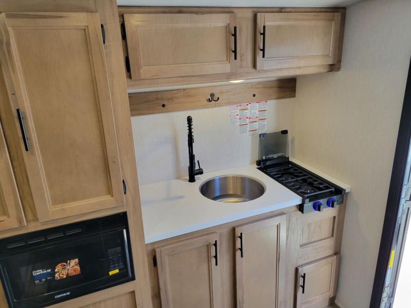 Comfortable and cozy is how to describe this couples coach featuring a rear bath and front kitchen layout! The front kitchen offers a large pantry, a round sink for cleaning up, and a flushmount range plus a microwave oven. The refrigerator is just to the left of the entry door and opposite a large slide for added space that includes a bed and booth dinette. You also have an outdoor mini kitchen so when the weather is nice you can enjoy cooking and dining while enjoying your camp surroundings. With a 12' awning and outside TV mount, you could easily make this an enjoyable space to hang out with family and friends in the campground.
