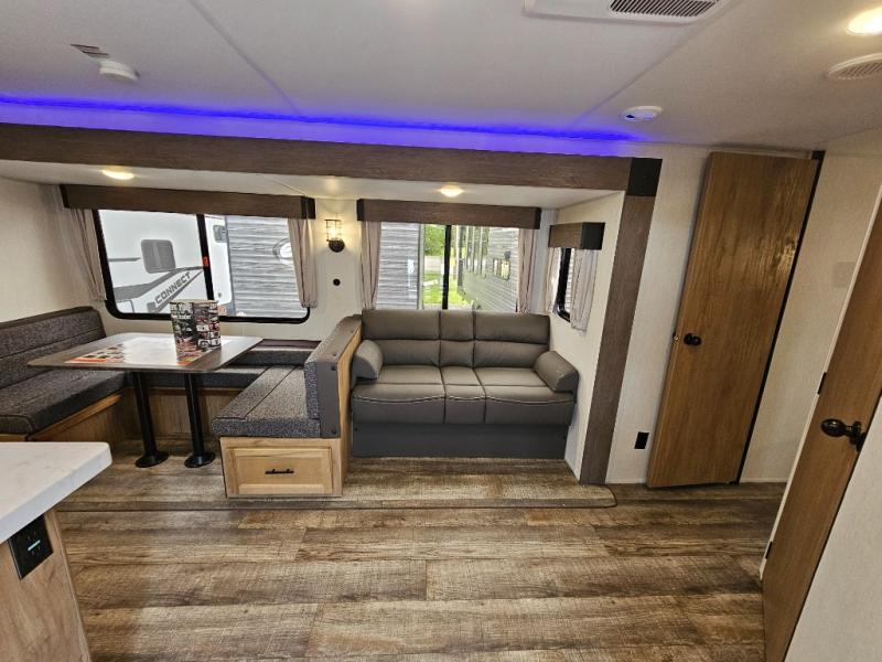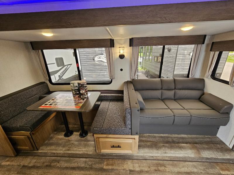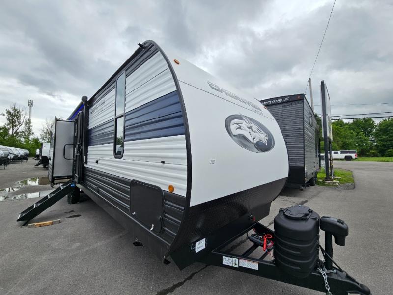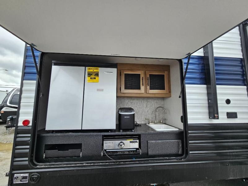 Three slides create spacious living areas in this travel trailer! The chef can prepare their best meals either indoors with the three burner cooktop and air fryer/convection microwave, or at the outdoor bar and grill with a 5.6 cu. ft. refrigerator and all of the essentials for easy cooking. The kids or guests can sleep in the rear private bunkhouse with the double bunk above a single bunk, a flip up bunk above a sofa slide, a TV mount, and a wardrobe for their clothes. The front private bedroom has a walk around queen bed to lay your head on, a TV mount, and an entrance into the dual entry bathroom. The kitchen island will make meal prepping easier, the large pantry is big enough for everyone's favorite snacks, the closet helps keep the coats out of the way, and the U-shaped dinette and sofa slide offer comfortable seating/sleeping spaces!