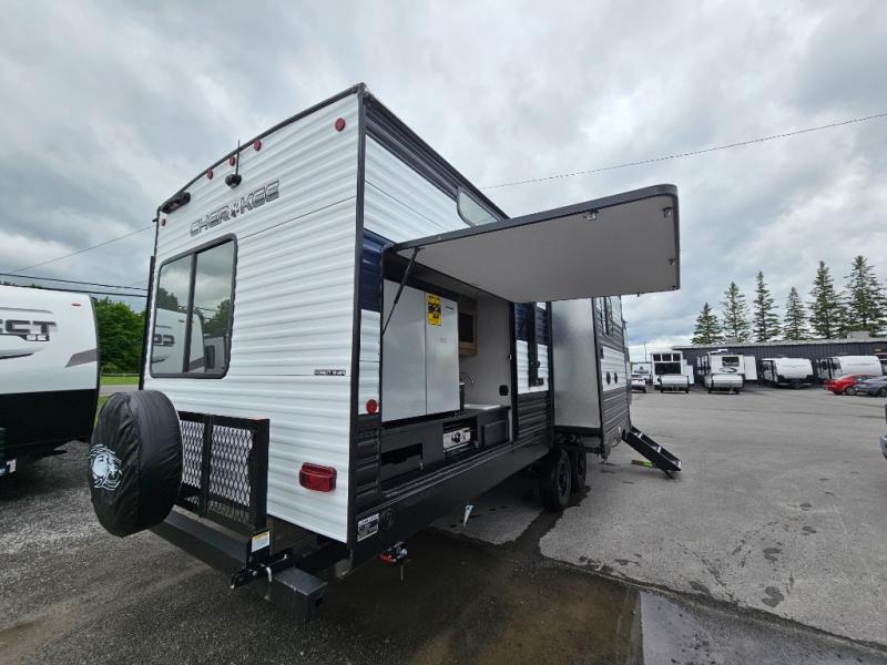 If the open road is calling your name, then answer it with one of these Forest River Cherokee travel trailers or toy haulers! A seamless roofing membrane with heat reflectivity covers these units and an armored underbelly tank enclosure protects it from road debris. The Power Gear frame technology holds them together and also comes with a space saver rail design. An outside shower with hot and cold water helps to keep the dirt outside where it belongs. With the Campfire package, you will get an air fryer, an on demand tankless water heater, bedroom cabinets, and more convenient features. A few other features you will appreciate include a super kitchen, USB charging station, and light filtering sheer shading premium blackout zebra shades for added privacy. Come find your favorite model today!