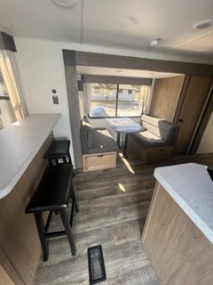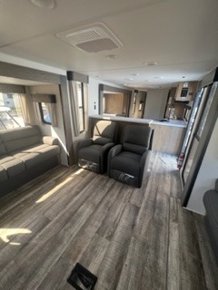 Affordable luxury and livability is what you will find in this travel trailer! The rear living area has opposing sofa slides, two recliners, a rear entertainment center with a fireplace, and panoramic windows for added natural lighting. There is even a bar top with two bar stools overlooking the living area so you can enjoy a meal and a movie. The booth dinette slide has a full door pantry next to it so you can quickly grab a snack during game night. Freshen up each morning in the full bathroom with the shower with a seat. The front private bedroom has a walk around queen bed for a good night's rest and a linen closet with an area prepped to add the optional washer and dryer. You even have an outside kitchen, a rear storage rack, outside storage areas, and an outside TV mount!