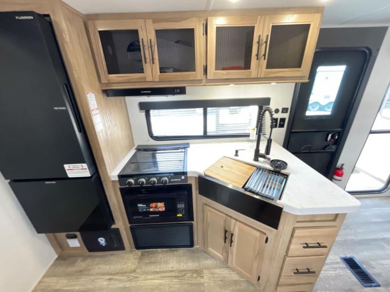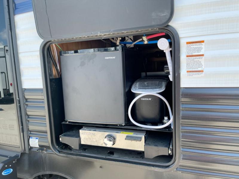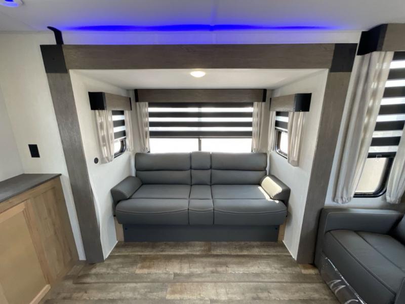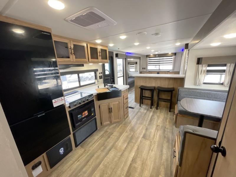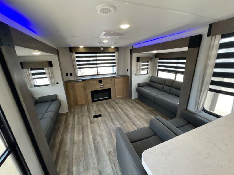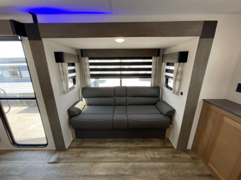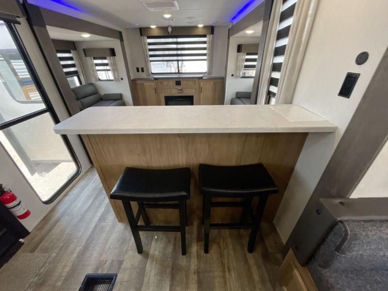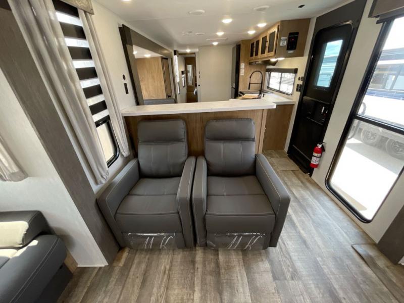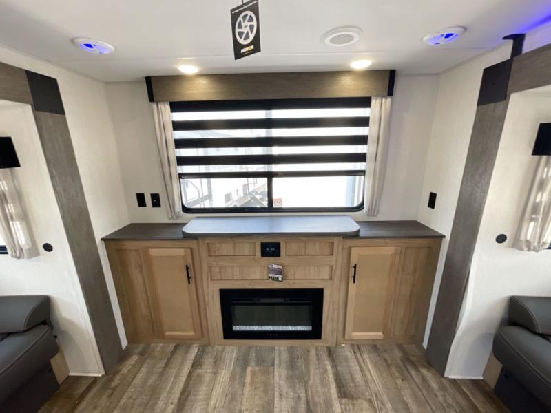 Affordable luxury and livability is what you will find in this travel trailer! The rear living area has opposing sofa slides, two recliners, a rear entertainment center with a fireplace, and panoramic windows for added natural lighting. There is even a bar top with two bar stools overlooking the living area so you can enjoy a meal and a movie. The booth dinette slide has a full door pantry next to it so you can quickly grab a snack during game night. Freshen up each morning in the full bathroom with the shower with a seat. The front private bedroom has a walk around queen bed for a good night's rest and a linen closet with an area prepped to add the optional washer and dryer. You even have an outside kitchen, a rear storage rack, outside storage areas, and an outside TV mount!