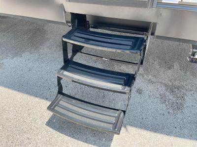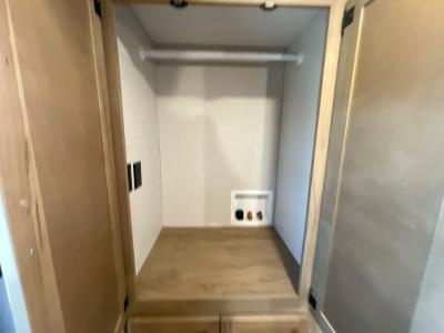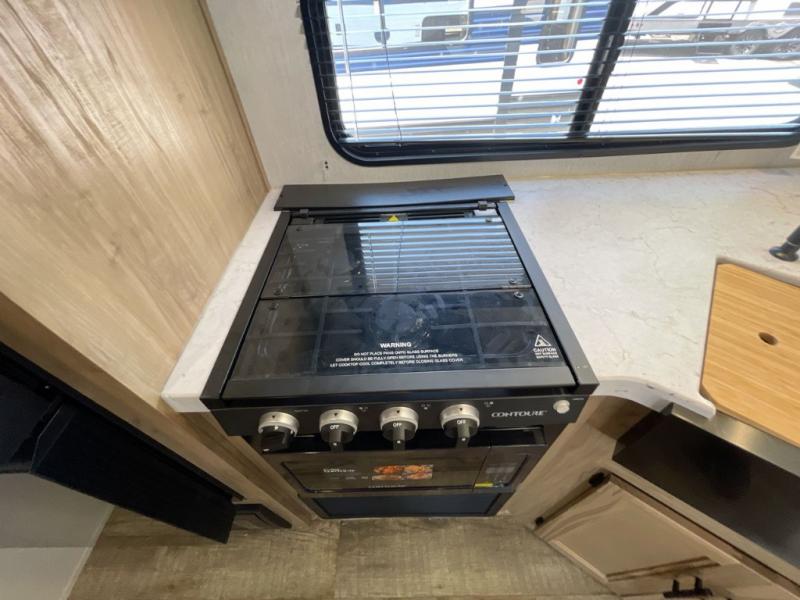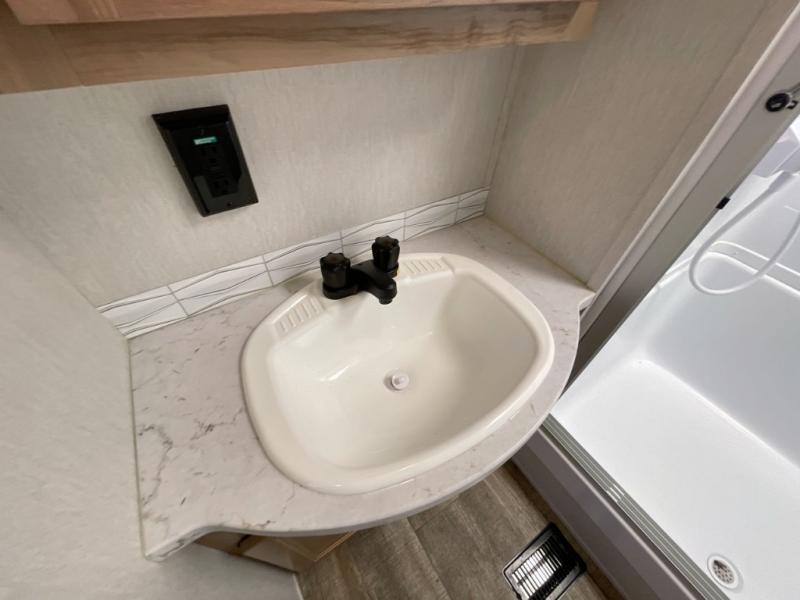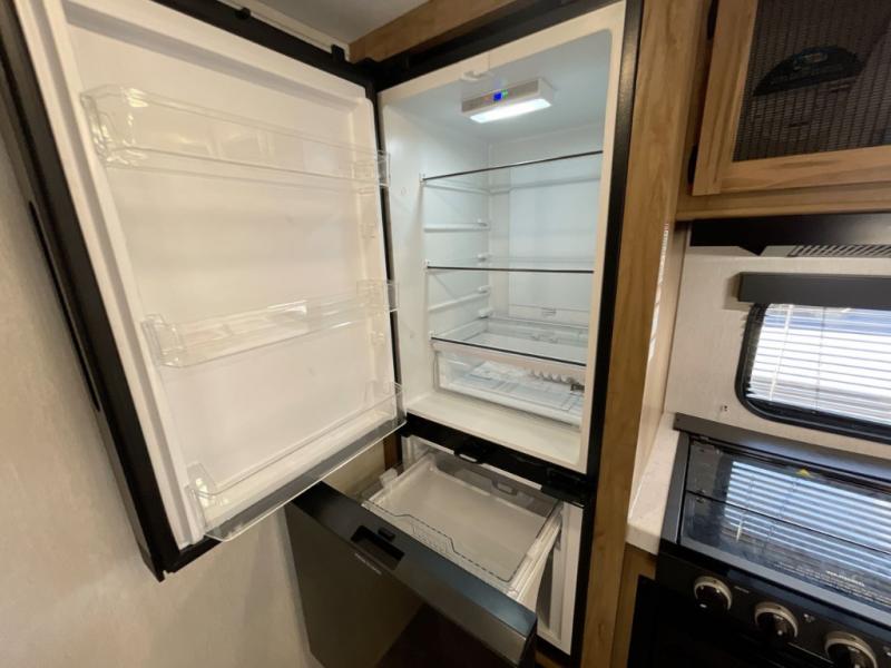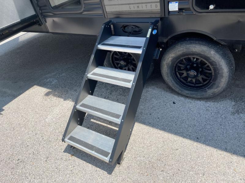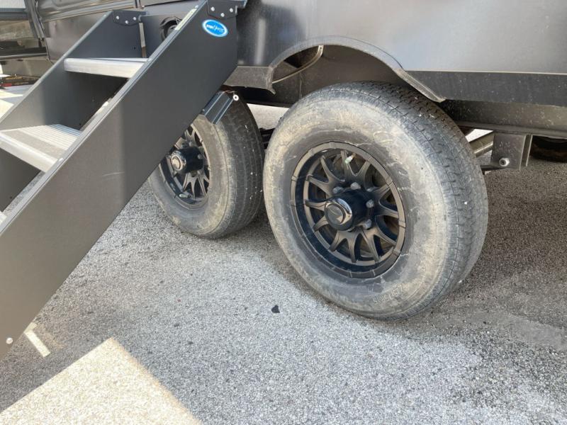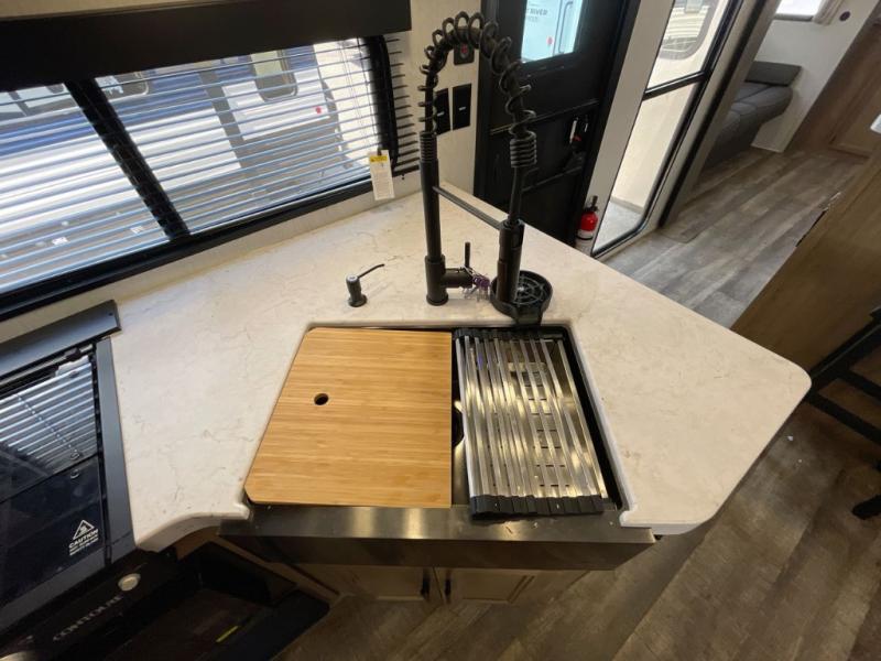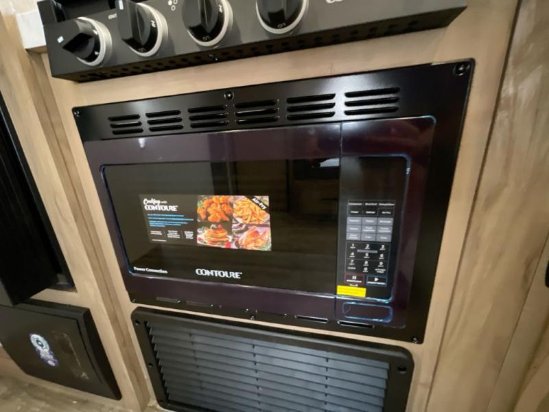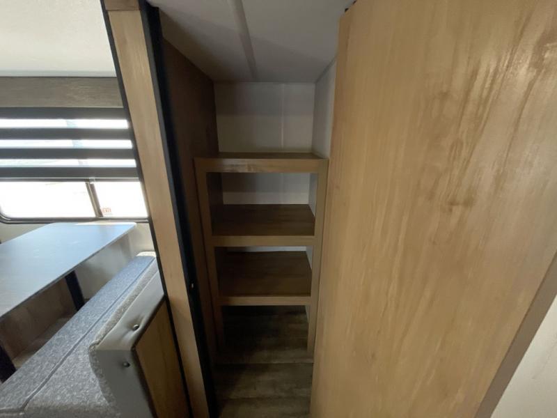 Affordable luxury and livability is what you will find in this travel trailer! The rear living area has opposing sofa slides, two recliners, a rear entertainment center with a fireplace, and panoramic windows for added natural lighting. There is even a bar top with two bar stools overlooking the living area so you can enjoy a meal and a movie. The booth dinette slide has a full door pantry next to it so you can quickly grab a snack during game night. Freshen up each morning in the full bathroom with the shower with a seat. The front private bedroom has a walk around queen bed for a good night's rest and a linen closet with an area prepped to add the optional washer and dryer. You even have an outside kitchen, a rear storage rack, outside storage areas, and an outside TV mount!