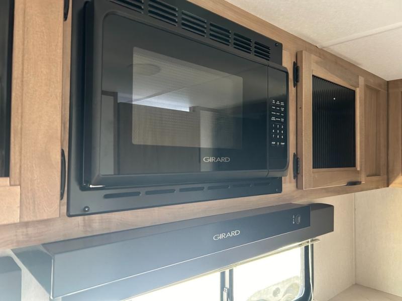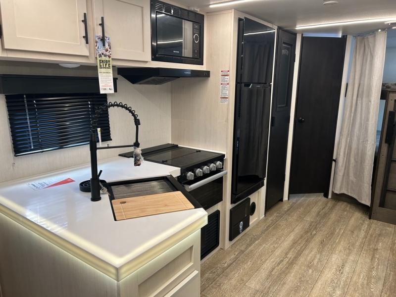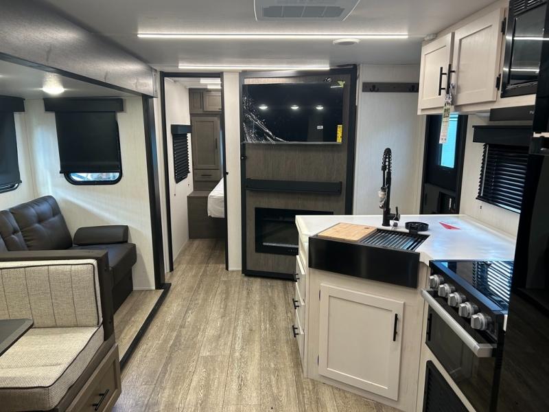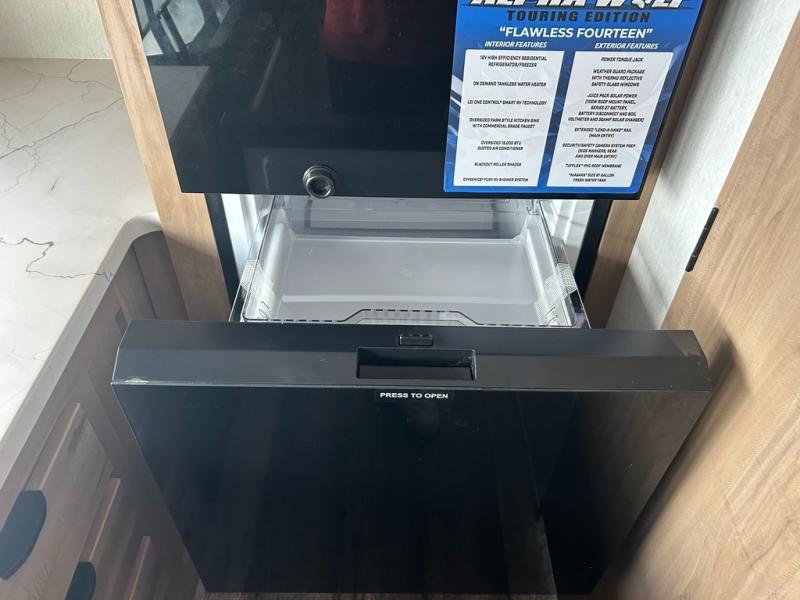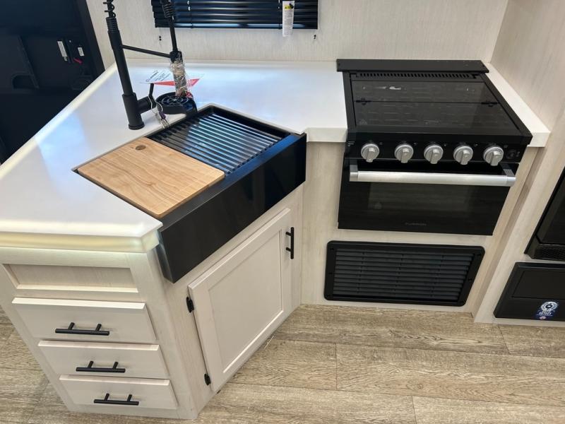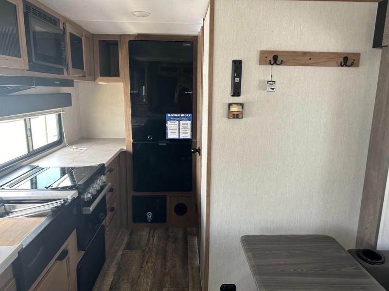 With any Alpha Wolf Touring Edition travel trailer by Forest River you will enjoy at-home comforts at every turn. There is an armored underbelly, upgraded laminated exterior walls with block foam insulation, plus a PVC roof membrane with heat reflectivity so you can camp year around. You will love the blackout kitchen appliance package included within the Limited Package, along with an on-demand tankless water heater, slam latch storage doors with "Safety Stay" magnets, plus On The Go rear ladder prep. The features continue on in the Convenience Package with Leash Latch pet safety technology, an outside shower with hot and cold water, seamless countertops throughout, and tire pressure safety sensors! The Juice Pack with a 100W solar panel, battery disconnect and 30 amp solar charge will provide off-grid capabilities, and the home security/safety camera system prep means you can add this option to help keep your items and loved ones secure.
