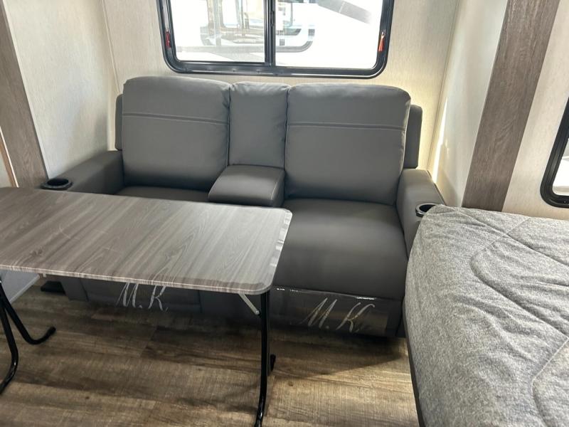 This versatile couples trailer provides you with plenty of room during the day with a single slide theater seat and removable table and sofa, then at night, flip down the Murphy bed for a great night's rest. You won't even have to make the bed in the morning, just flip it up into the wall in between two wardrobes and nightstands for your clothing and personal belongings. There is also a large overhead cabinet for more storage. The rear corner bath will allow you to freshen up each day with a nice shower including skylight for more natural lighting and head room. You will also find a porcelain toilet and vanity with sink and medicine cabinet. Cook easily with a range and microwave oven, a 12V refrigerator, and store your dishes and dry goods in the overhead cabinets. Outside, a 15' awning will provide more living space just outside the door, and there is outside storage for your gear to keep everything tucked away when not in use.