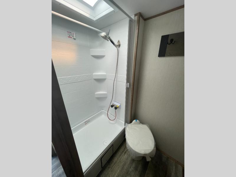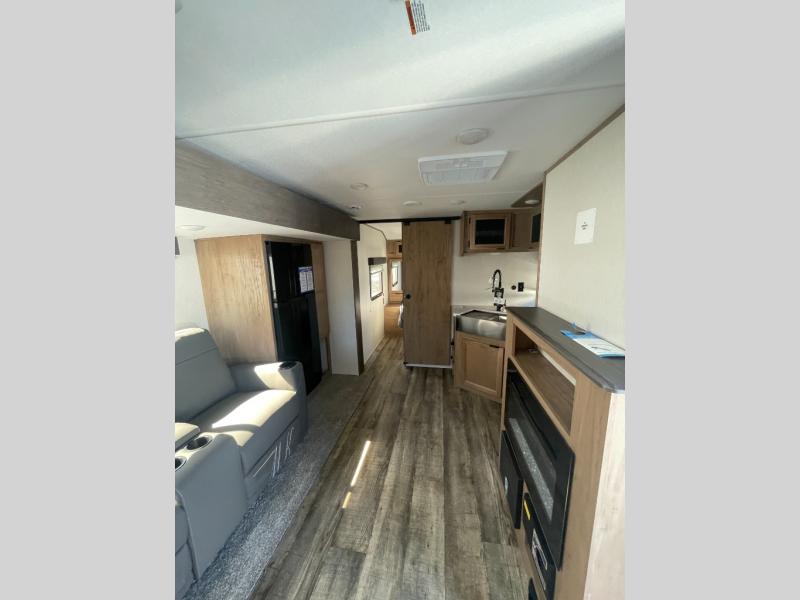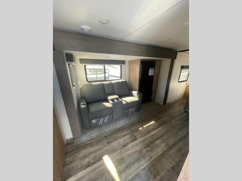 Looking for the perfect trailer for two with a spacious bathroom and bedroom? This Alpha Wolf provides a rear oversized bathroom complete with linen storage and a barn-style door that saves space and looks great. The front bedroom includes a walk-around queen bed, dual shirt closets and nightstands, a farm-style door plus windows for natural lighting and great views. The main living and kitchen area is spacious as well with a large slide out that includes theater seating with cupholders across from the entertainment center with a fireplace, a 12V residential refrigerator for lots of cold storage, and a pantry for your snacks and dry goods. You can decide to cook indoors on the three burner cooktop, or head outdoors to cook on the deluxe outside kitchen, complete with a two burner cooktop, a refrigerator, a sink, and ice!