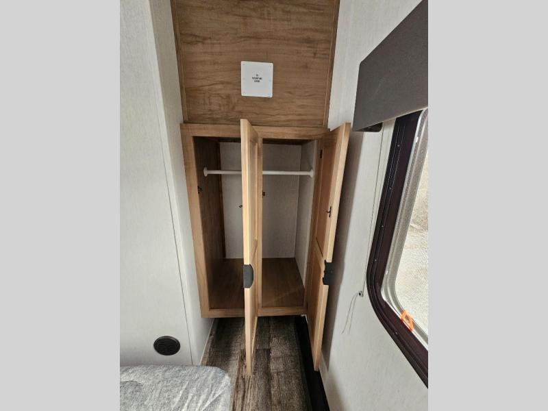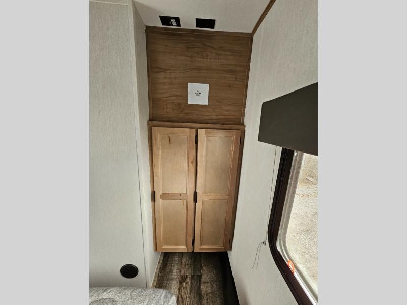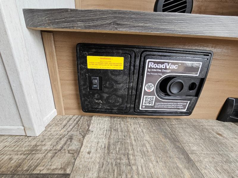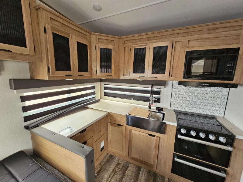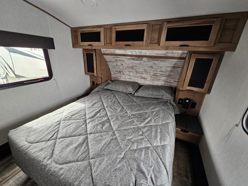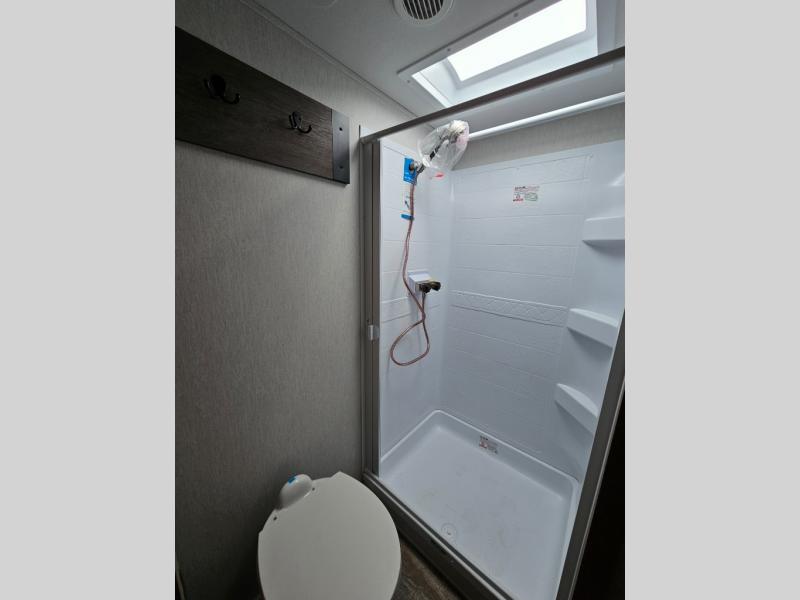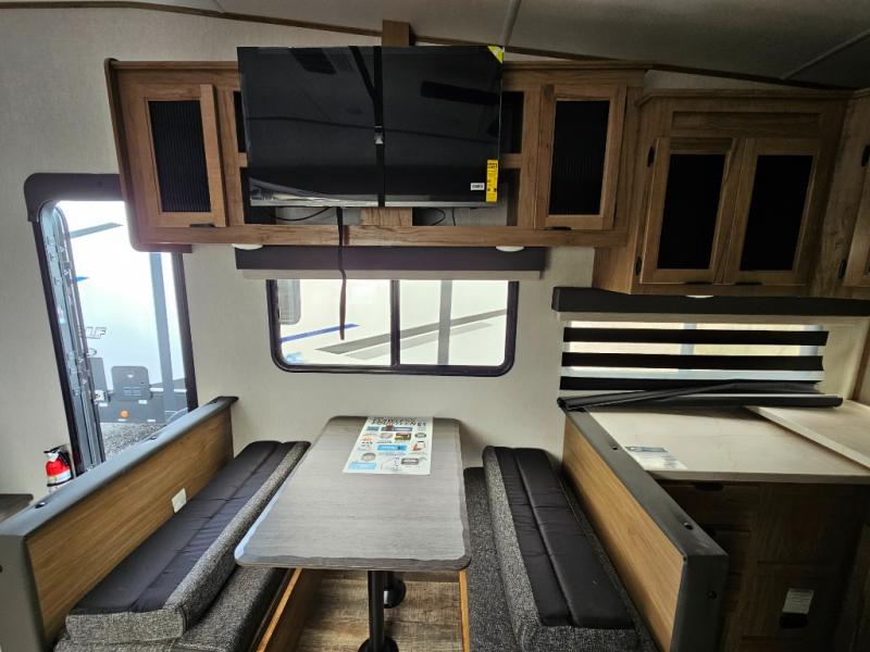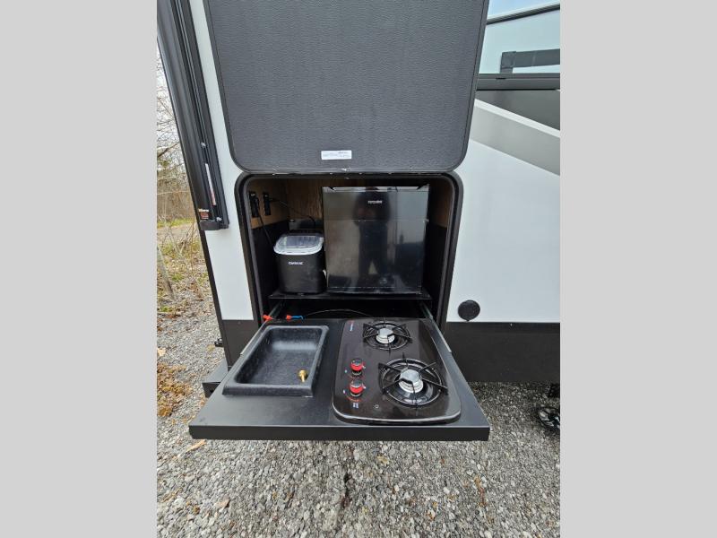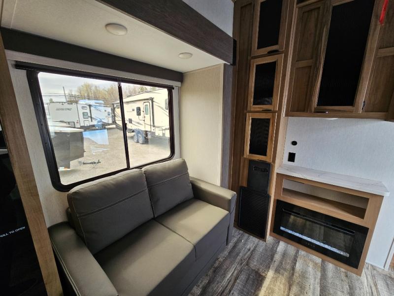 You and your spouse will love camping in this fifth wheel! The front private bedroom has a queen bed for a good night's rest with wardrobes and USB ports on either side for your electronics to charge while you do. Inside the full bathroom is a shower with a removable shower rod for hang-drying your clothes. The centralized ceiling fan will help to circulate the cool air from the 15,000 BTU air conditioner so you can stay cool as you prepare delicious meals in the rear kitchen. You even have two pantries for all of your snacks, a hutch for your dishes, and an electric fireplace to enjoy either on the tri-fold sofa or booth dinette. The outside kitchen is under the 20' awning so you can stay protected while you cook in the great outdoors!