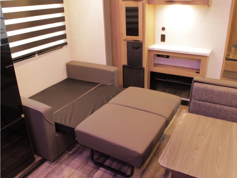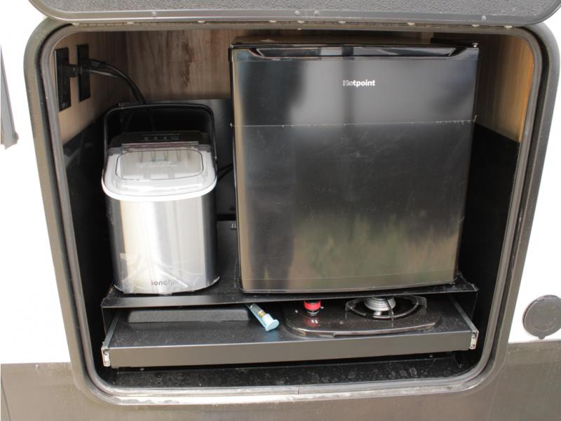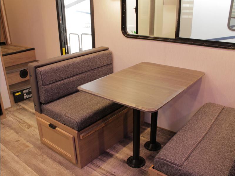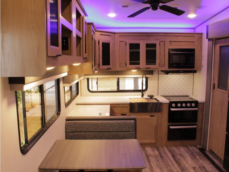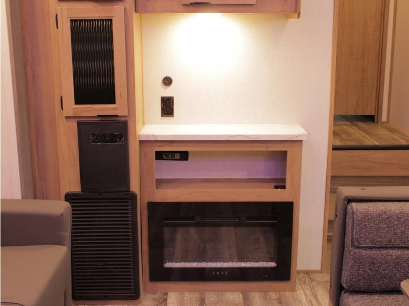 You and your spouse will love camping in this fifth wheel! The front private bedroom has a queen bed for a good night's rest with wardrobes and USB ports on either side for your electronics to charge while you do. Inside the full bathroom is a shower with a removable shower rod for hang-drying your clothes. The centralized ceiling fan will help to circulate the cool air from the 15,000 BTU air conditioner so you can stay cool as you prepare delicious meals in the rear kitchen. You even have two pantries for all of your snacks, a hutch for your dishes, and an electric fireplace to enjoy either on the tri-fold sofa or booth dinette. The outside kitchen is under the 20' awning so you can stay protected while you cook in the great outdoors!