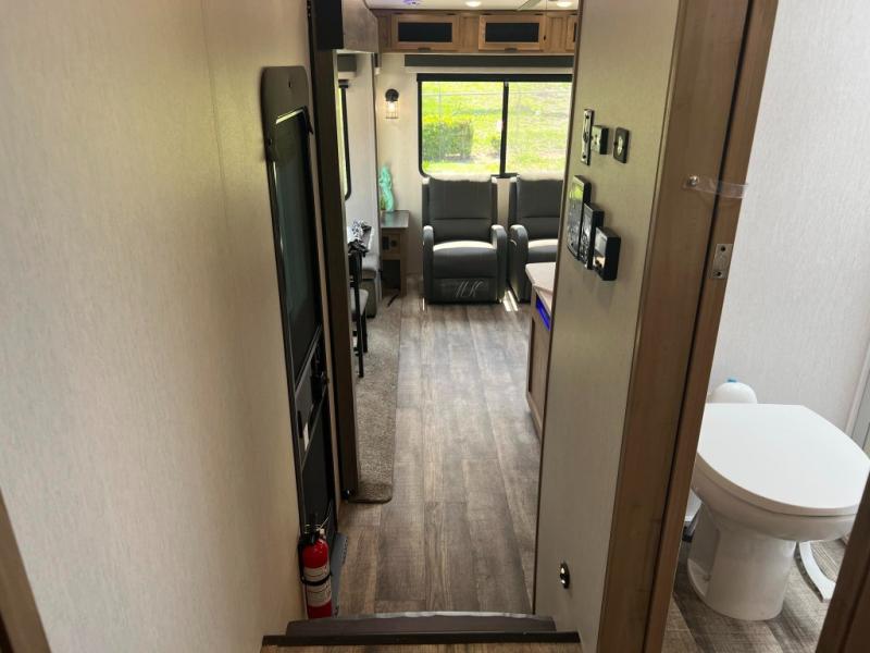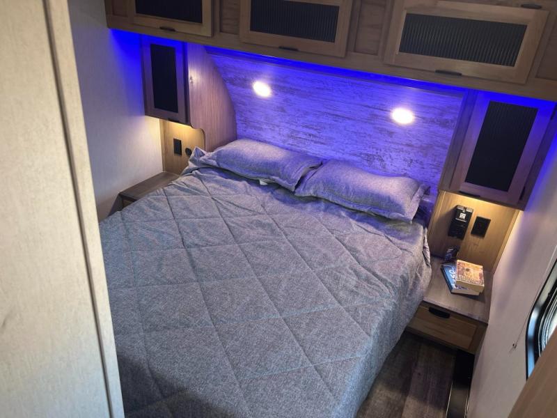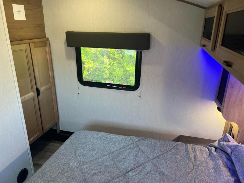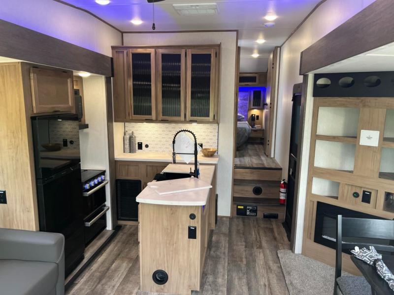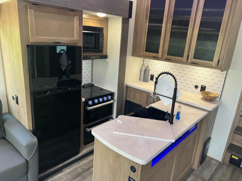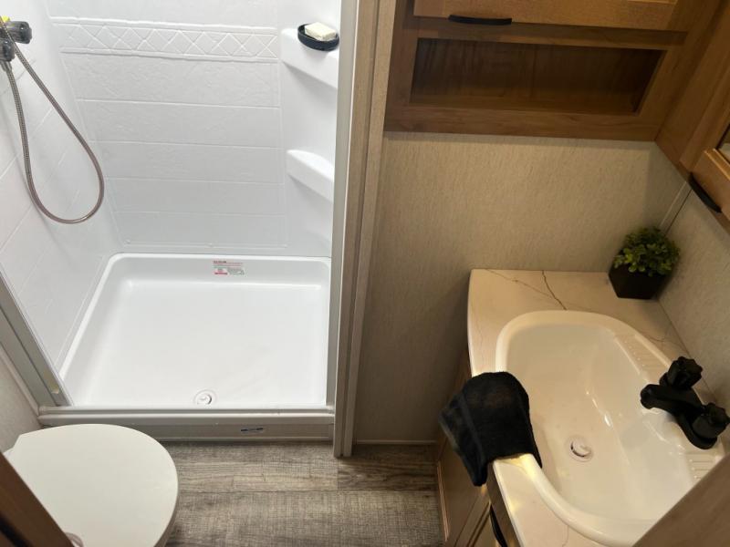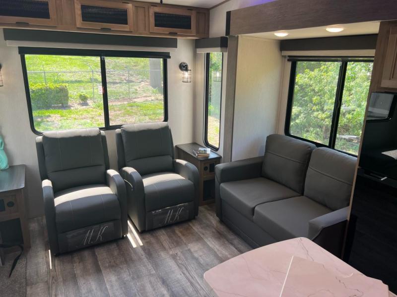 This fifth wheel is perfect for couple's but also has enough space for company too! The rear living area features two recliners with end tables on either side to set your cup of coffee, a tri-fold sofa that can transform into an extra sleeping space, and free standing table with chairs and storage ottoman seat to enjoy your meals by the electric fireplace. The fully equipped kitchen has everything you need including a convenient wine rack. After a fun-filled day at the beach, rinse off in the full bathroom with the shower and hang your swimsuit up to dry on the removable shower rod when you're done. The front private bedroom has a queen bed to lay your head on at night and there is even USB ports on either side to charge your electronics!