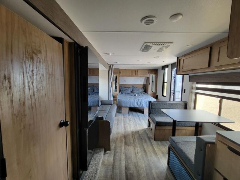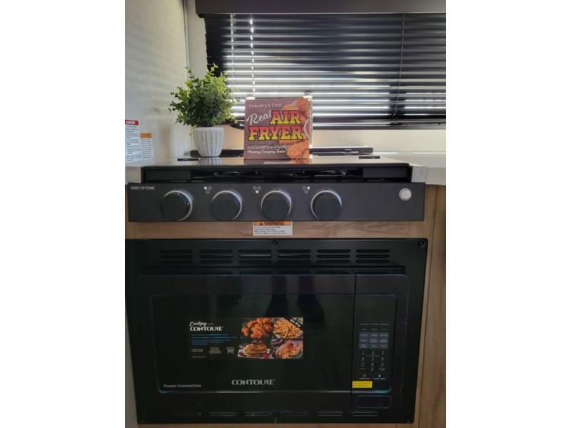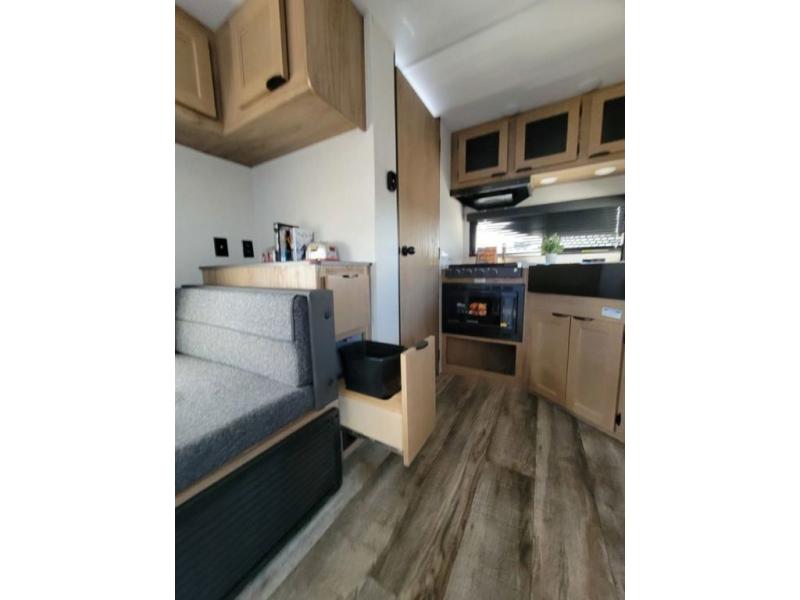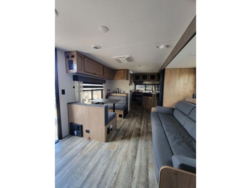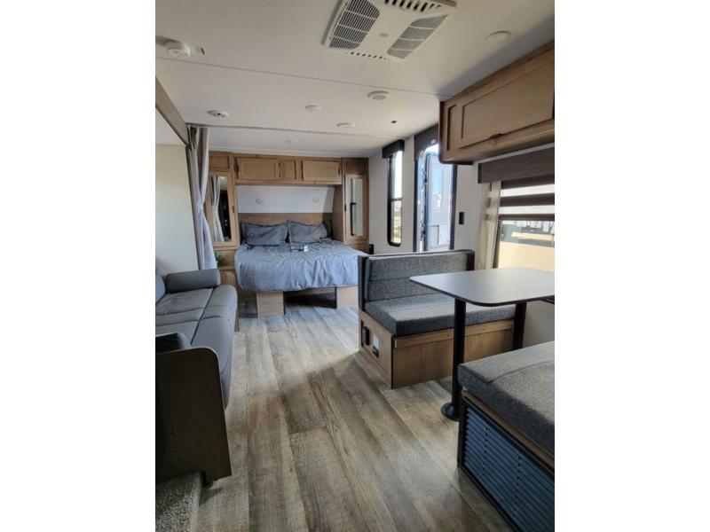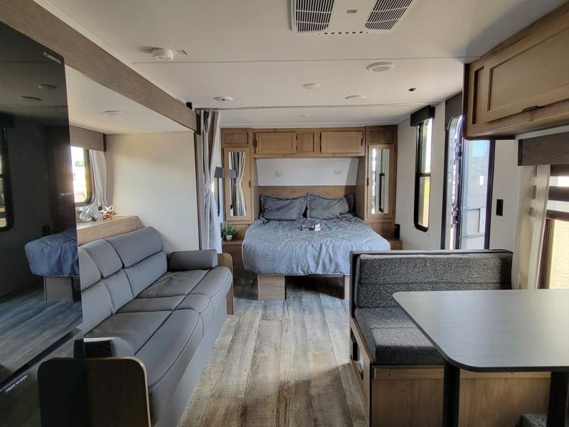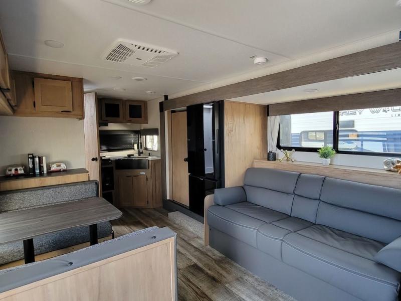 You will love traveling with this Cherokee Grey Wolf in tow. This is a great unit for a couple or family as the booth dinette and sofa can both be used for added sleeping for children or quests if needed. There is a comfortable queen bed up front that you will love for a great night's rest with storage space in nightstands and wardrobes for your clothing and things on either side of the bed. A two burner cooktop and air fryer is available for cooking inside, and the rear corner bath includes a tub/shower, toilet and sink. A nice 15' awning creates more outdoor living space to enjoy protected from the elements both day and night with an LED light strip for after dark. You can also add a TV on the exterior as it has an outside TV mount.