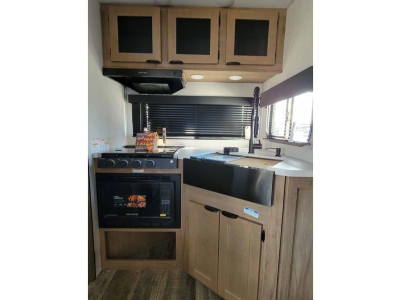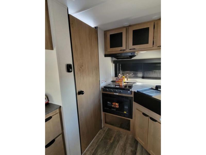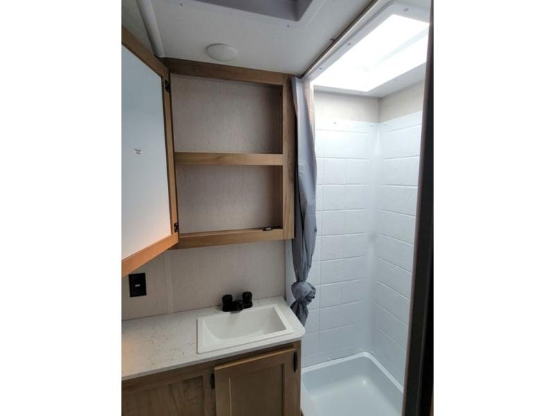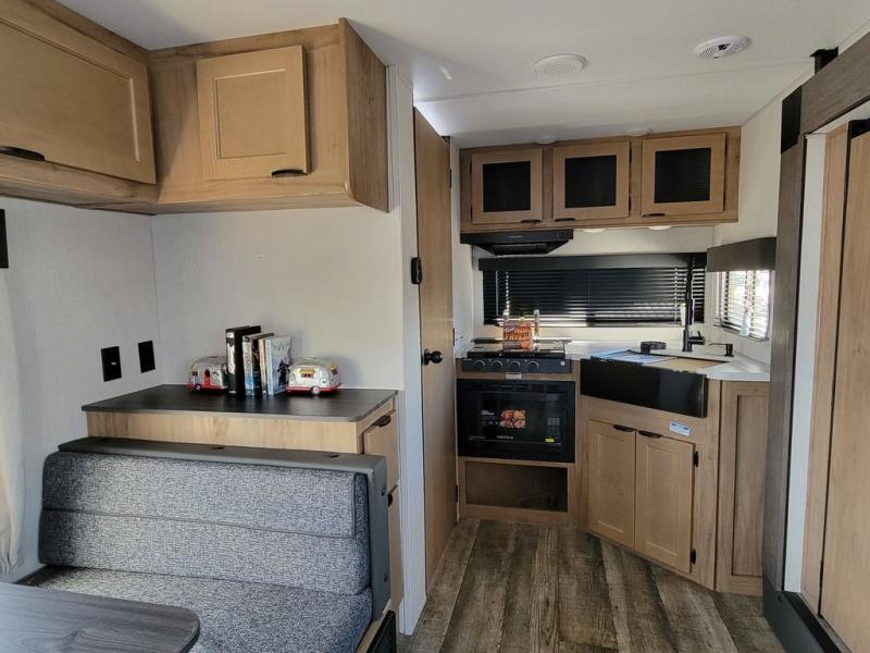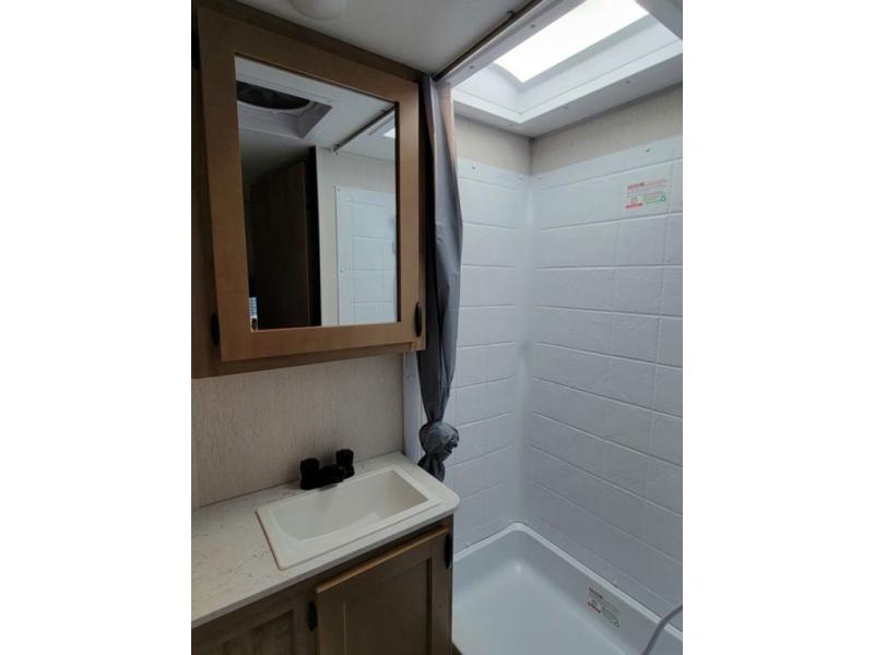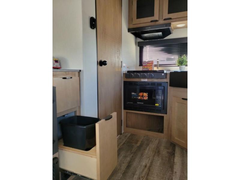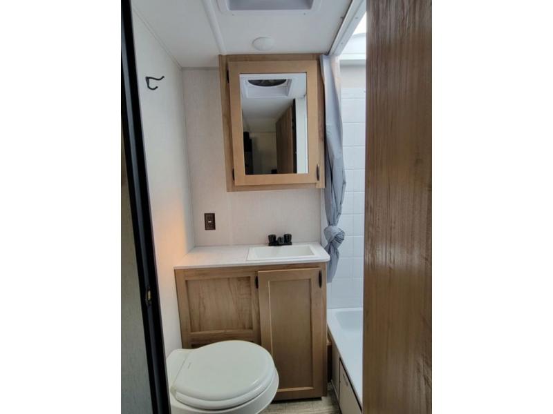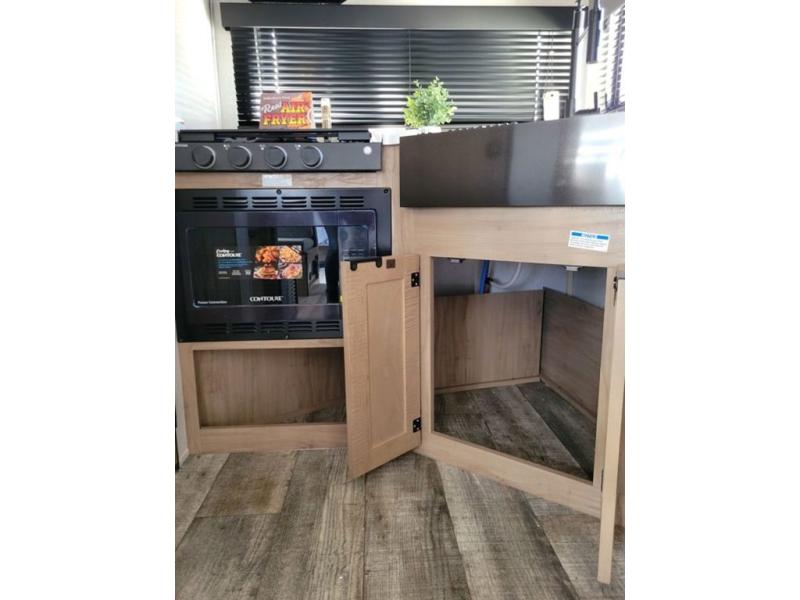 You will love traveling with this Cherokee Grey Wolf in tow. This is a great unit for a couple or family as the booth dinette and sofa can both be used for added sleeping for children or quests if needed. There is a comfortable queen bed up front that you will love for a great night's rest with storage space in nightstands and wardrobes for your clothing and things on either side of the bed. A two burner cooktop and air fryer is available for cooking inside, and the rear corner bath includes a tub/shower, toilet and sink. A nice 15' awning creates more outdoor living space to enjoy protected from the elements both day and night with an LED light strip for after dark. You can also add a TV on the exterior as it has an outside TV mount.