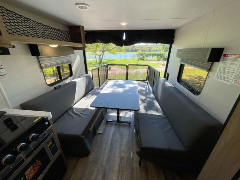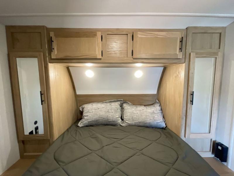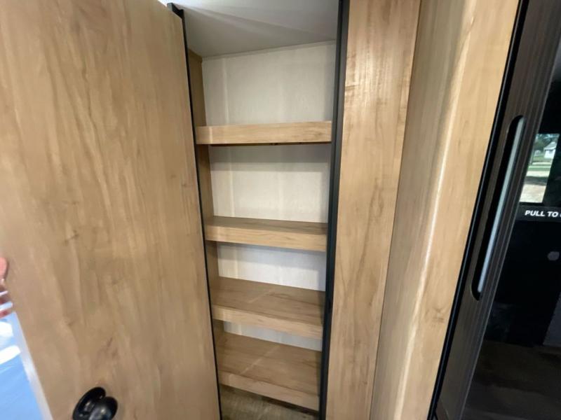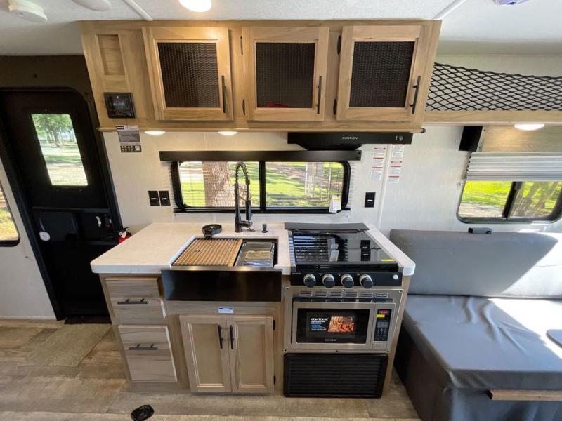 You will love this Cherokee Grey Wolf toy hauler with a rear ramp door for loading and unloading your toys and gear. If you position the fold-down sofas up against the wall, you will have even more room for extra gear when you are moving down the road. Set up camp and easily create a great dining area with the table between each fold-down sofa. You can also create your best meals in a breeze with either the three-burner cooktop or the oven, plus there is a microwave for those quick meals. A large pantry allows you to pack all of the snacks and canned goods you need for your adventure. You will appreciate the master suite up front for a great night's rest on the queen bed along with easy access into the dual-entry bath.