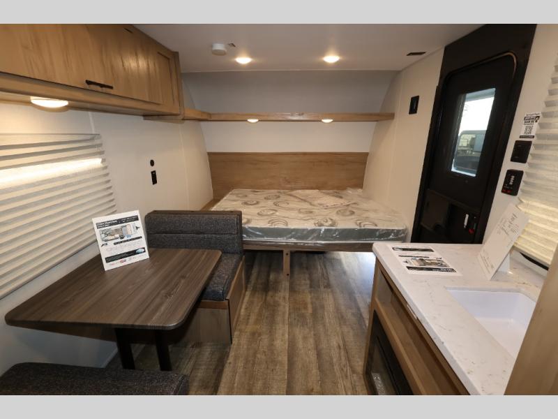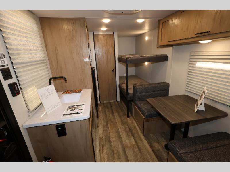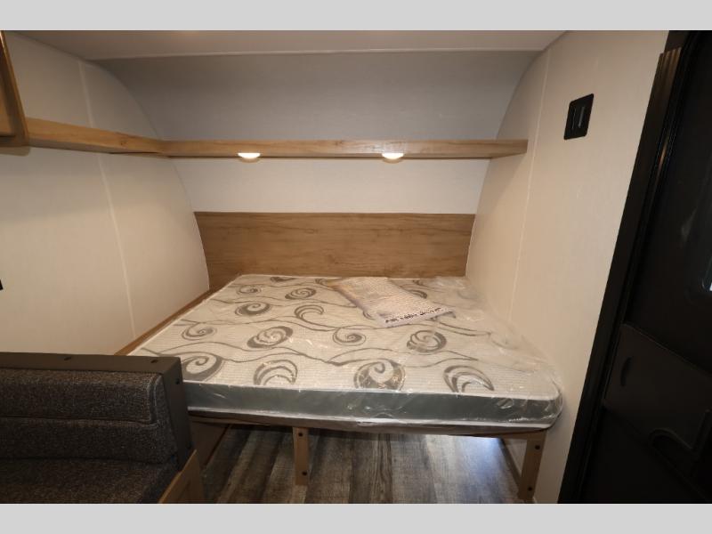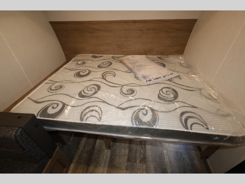 Enjoy family adventures in this all-electric bunk model which features sleeping for four or six depending on size with a queen bed up front, oversized bunks in the rear roadside corner, and you could even convert the booth dinette to sleep more. Inside, you will find ample storage with overhead cabinets and a large shelf above the queen bed, plus four shelves next to the refrigerator and microwave/air fryer that feature decorative storage bins for your things. Use this space for pantry items, towels, or clothing storage. There is even a 5,000 BTU electric fireplace below the counter and sink to bring you a bit of heat on those chilly nights, and you will find TV prep both inside and out if you wish to add TVs for more entertainment. On the outside, you will also find a 12' awning and plenty of outside storage for your camping gear, plus more!