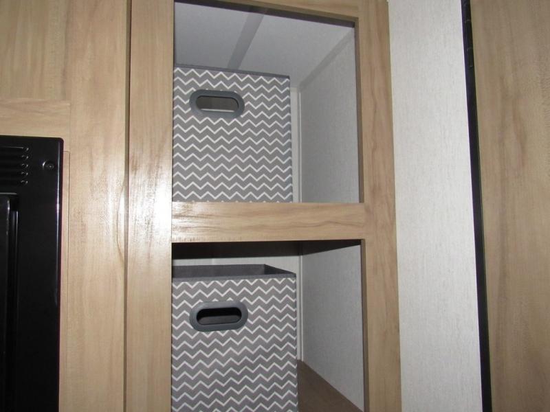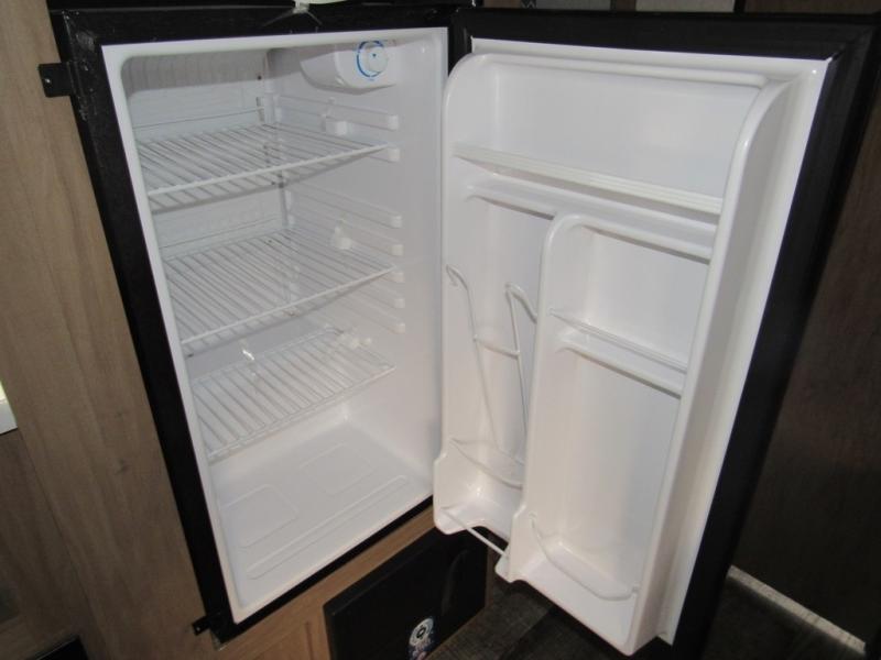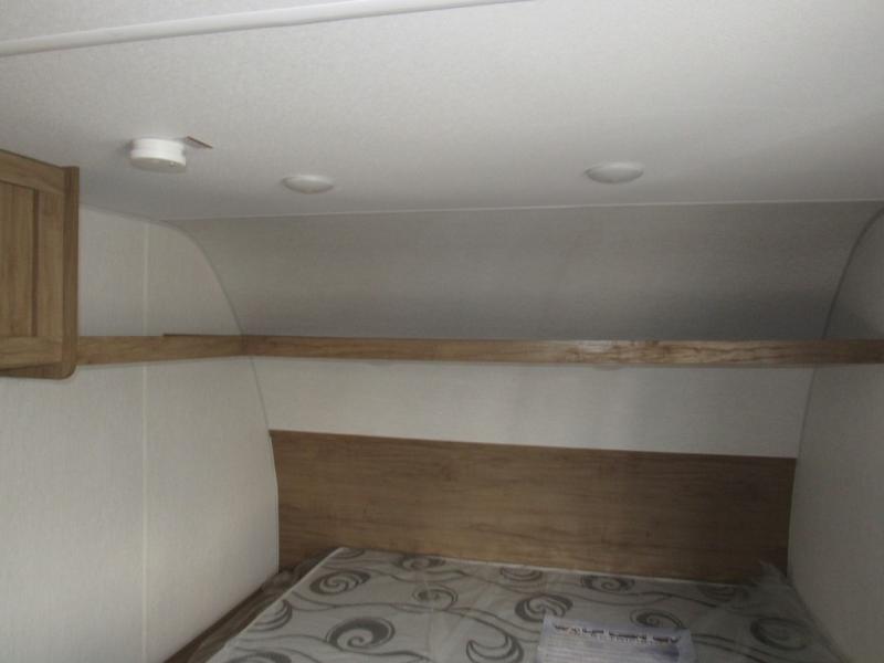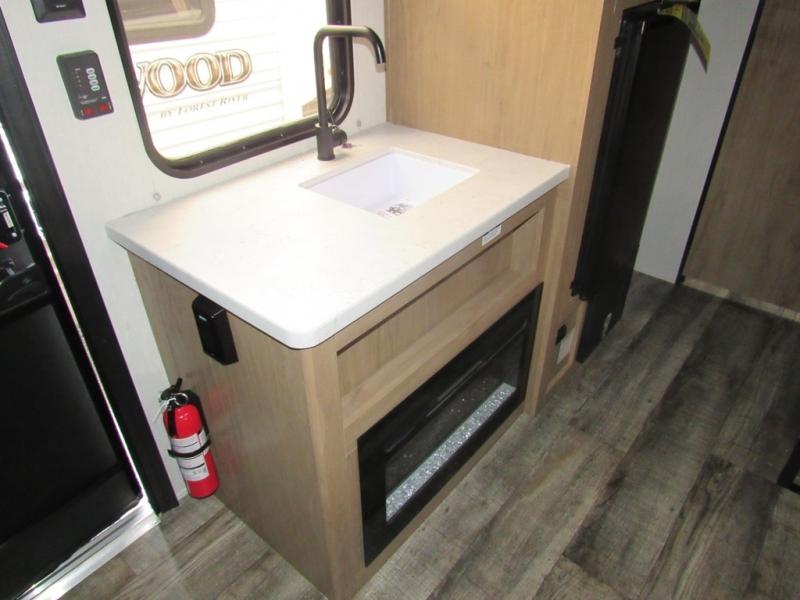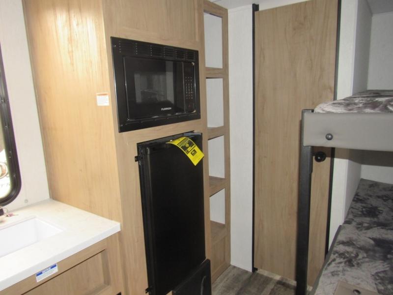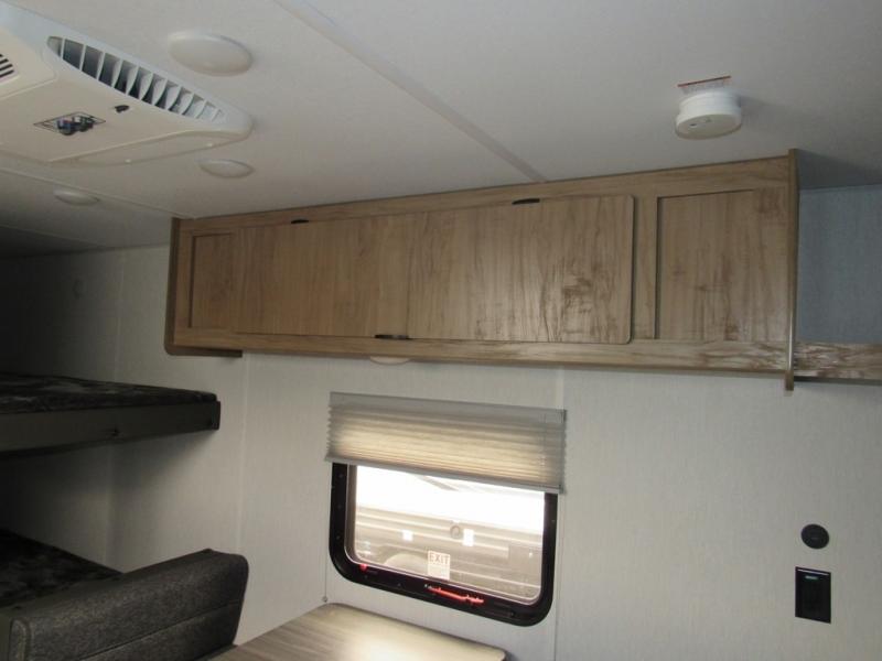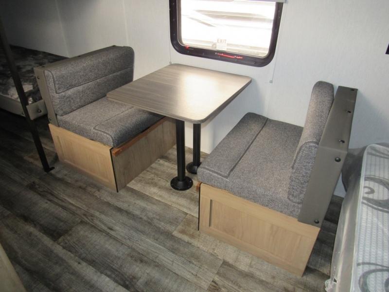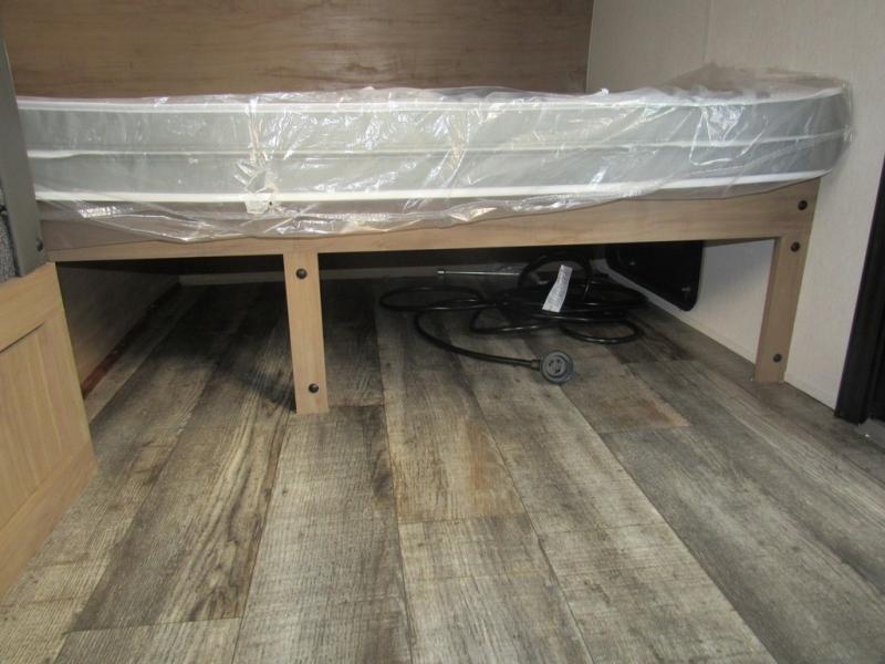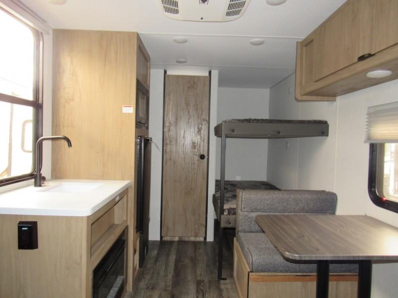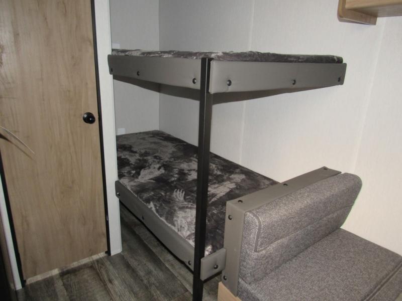 Enjoy family adventures in this all-electric bunk model which features sleeping for four or six depending on size with a queen bed up front, oversized bunks in the rear roadside corner, and you could even convert the booth dinette to sleep more. Inside, you will find ample storage with overhead cabinets and a large shelf above the queen bed, plus four shelves next to the refrigerator and microwave/air fryer that feature decorative storage bins for your things. Use this space for pantry items, towels, or clothing storage. There is even a 5,000 BTU electric fireplace below the counter and sink to bring you a bit of heat on those chilly nights, and you will find TV prep both inside and out if you wish to add TVs for more entertainment. On the outside, you will also find a 12' awning and plenty of outside storage for your camping gear, plus more!