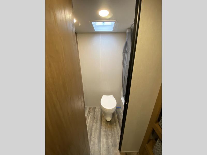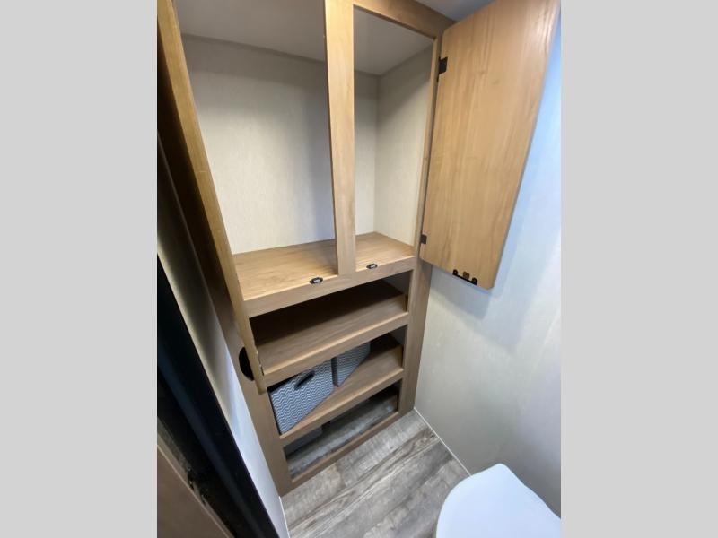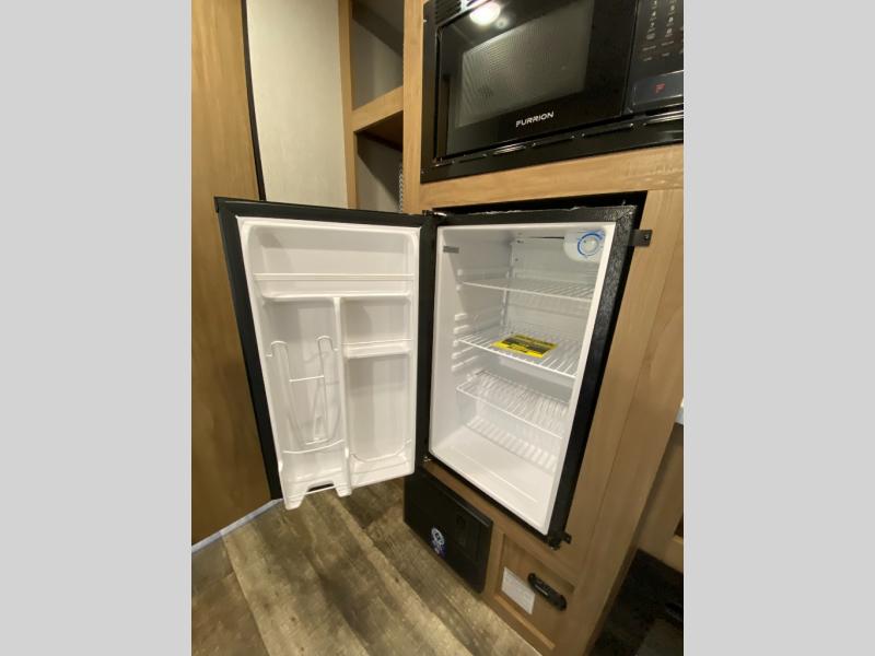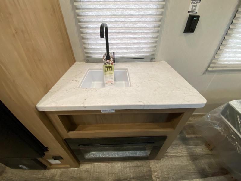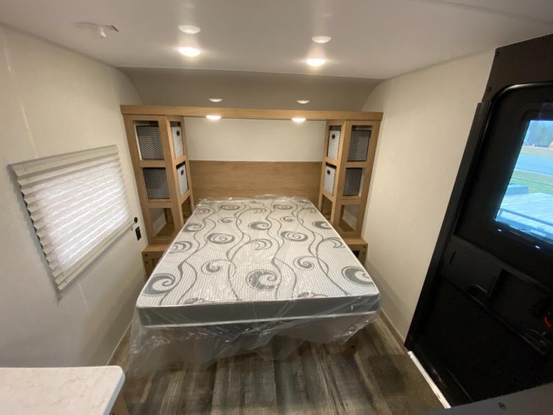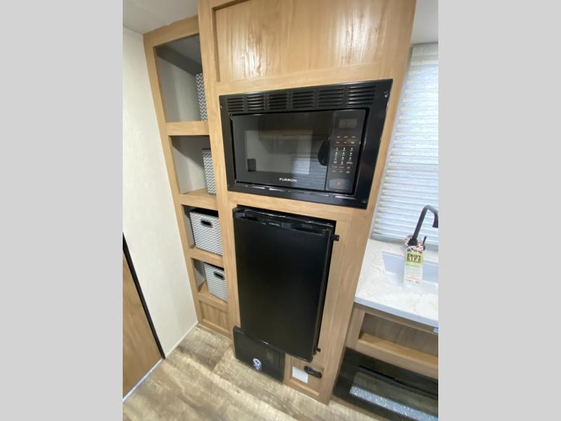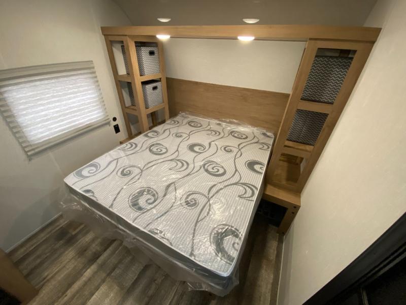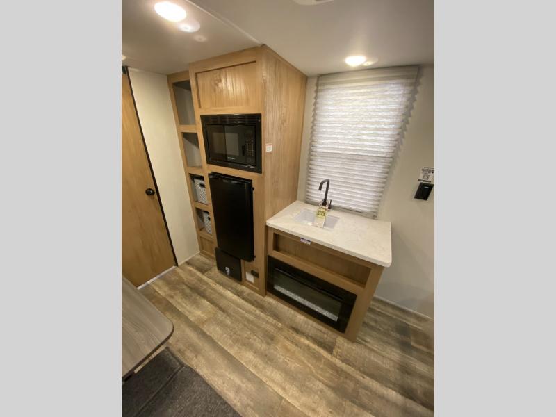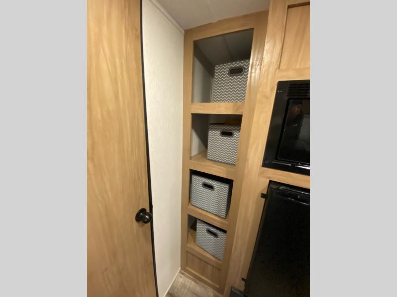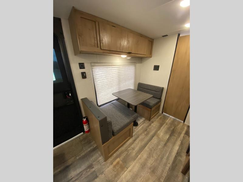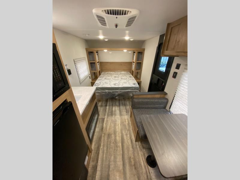 You will love weekends at the lake in this all-electric travel trailer that can sleep three each night! The front queen bed includes dual storage drawers on either side of the bed to keep your clothes tidy, and there is a shelf above the bed to keep books! After you've made breakfast, you can dine at the booth dinette and cleanup will be easy with the rectangle sink. A spacious full rear bath lets you clean up each day, and there is a closet with shelves to keep towels and toiletries. You'll find additional storage in the pantry with shelves next to the refrigerator and outside storage for camp chairs, tools, and more!