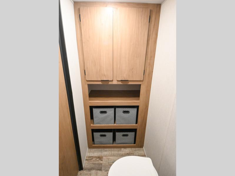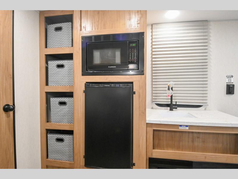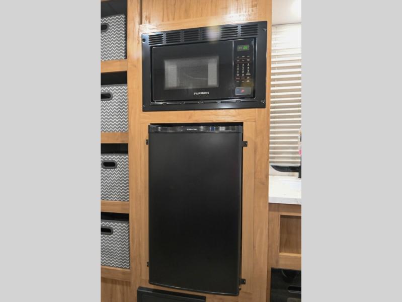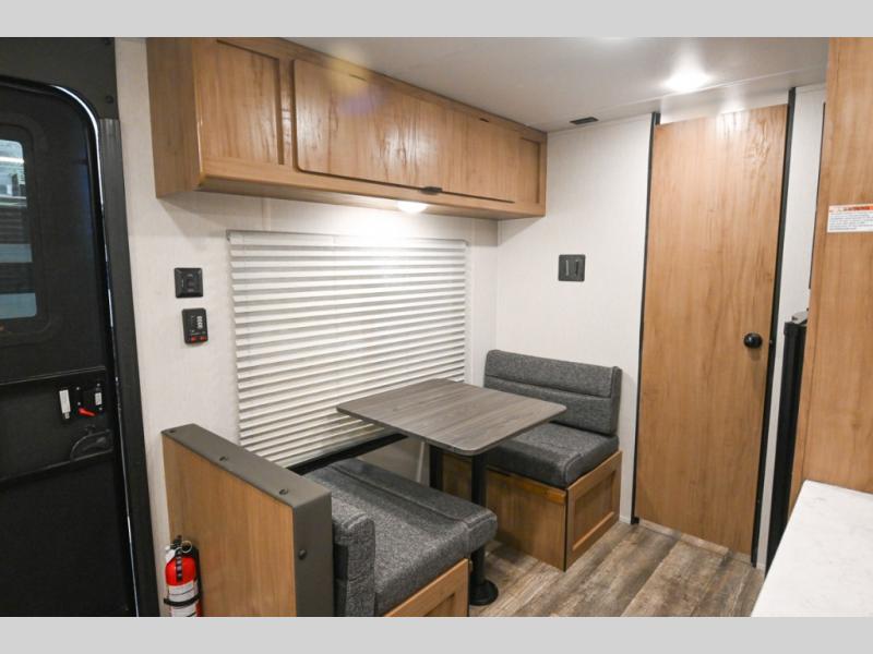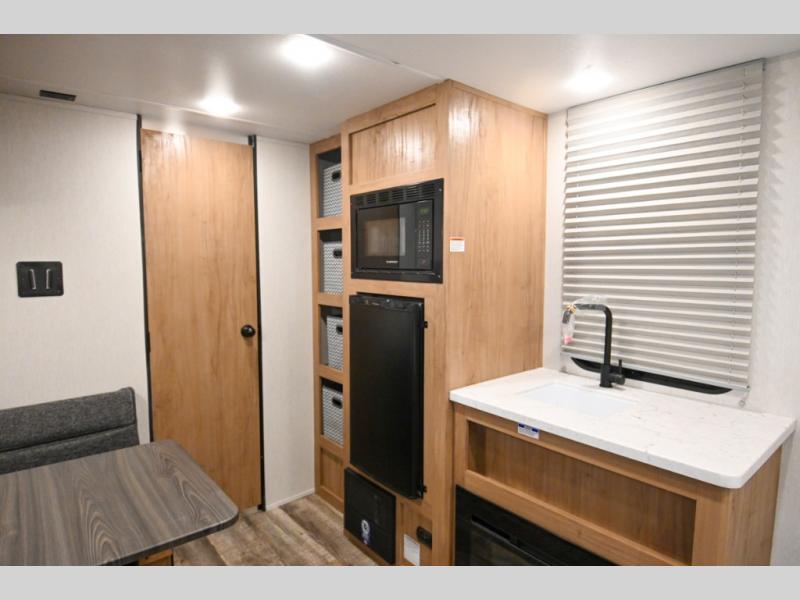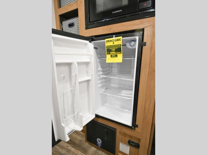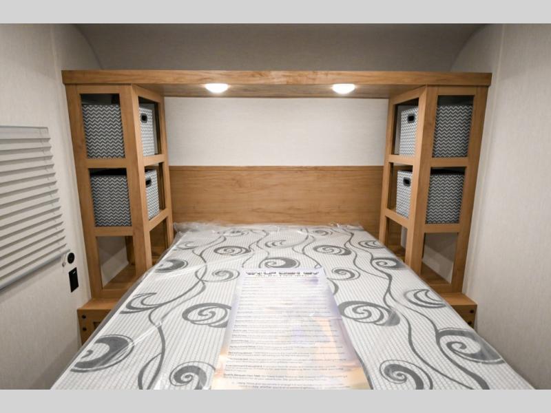 You will love weekends at the lake in this all-electric travel trailer that can sleep three each night! The front queen bed includes dual storage drawers on either side of the bed to keep your clothes tidy, and there is a shelf above the bed to keep books! After you've made breakfast, you can dine at the booth dinette and cleanup will be easy with the rectangle sink. A spacious full rear bath lets you clean up each day, and there is a closet with shelves to keep towels and toiletries. You'll find additional storage in the pantry with shelves next to the refrigerator and outside storage for camp chairs, tools, and more!