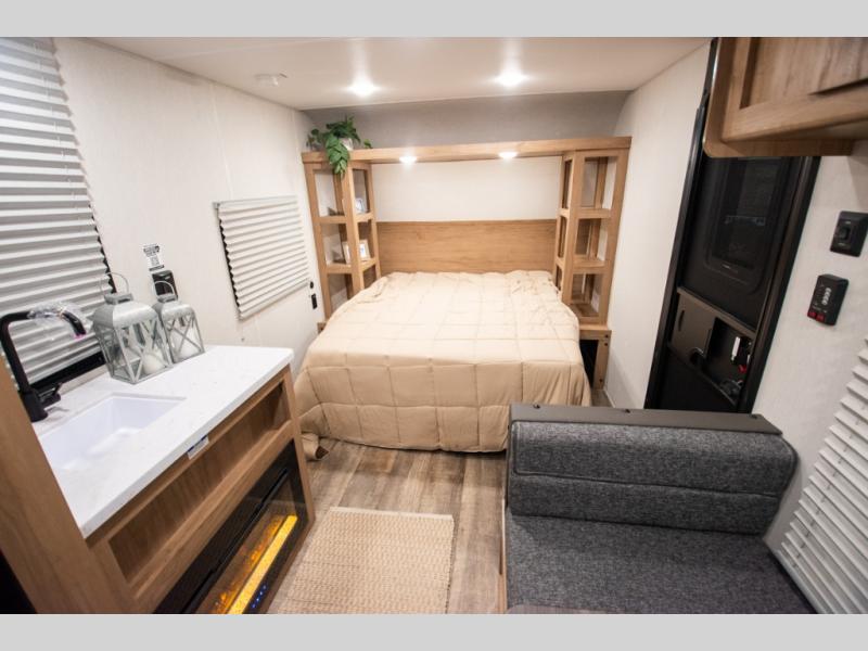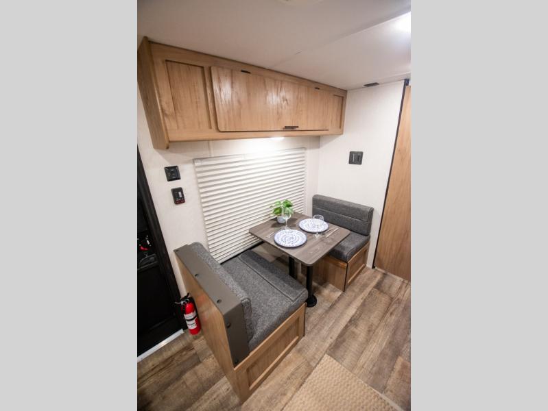 You will love weekends at the lake in this all-electric travel trailer that can sleep three each night! The front queen bed includes dual storage drawers on either side of the bed to keep your clothes tidy, and there is a shelf above the bed to keep books! After you've made breakfast, you can dine at the booth dinette and cleanup will be easy with the rectangle sink. A spacious full rear bath lets you clean up each day, and there is a closet with shelves to keep towels and toiletries. You'll find additional storage in the pantry with shelves next to the refrigerator and outside storage for camp chairs, tools, and more!