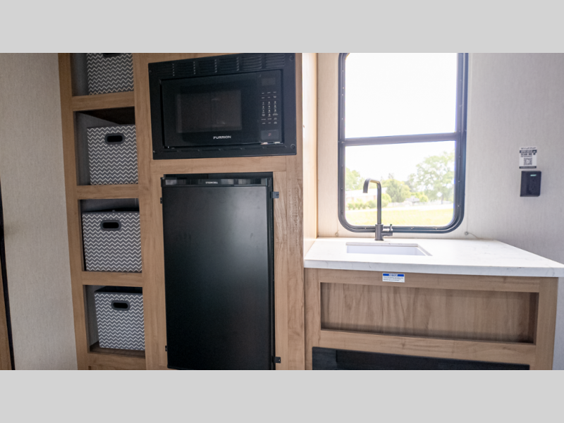 - All-electric model with convection microwave, 12' awning, outside storage & air fryer—modern camping with no propane tank hassles