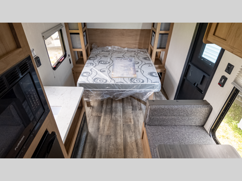 - Queen bed, booth dinette, pantry & compact fridge—efficient yet comfortable layout