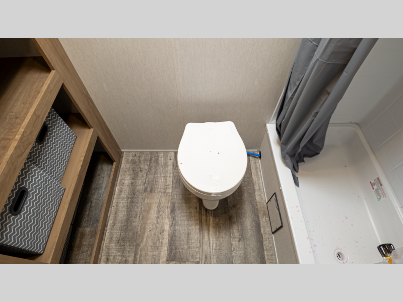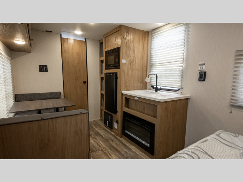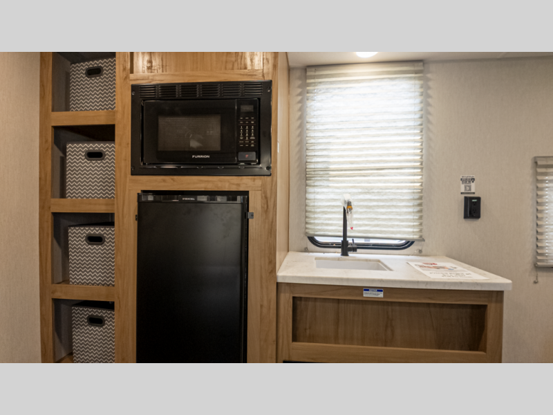 - Full utilities packed in: Bath, fridge, AC, and kitchen without the bulk of larger models