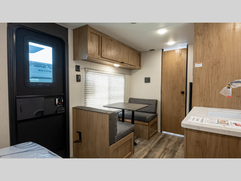 - Cozy living area: Booth dinette across from kitchen with 6 cu ft fridge and two-burner cooktop