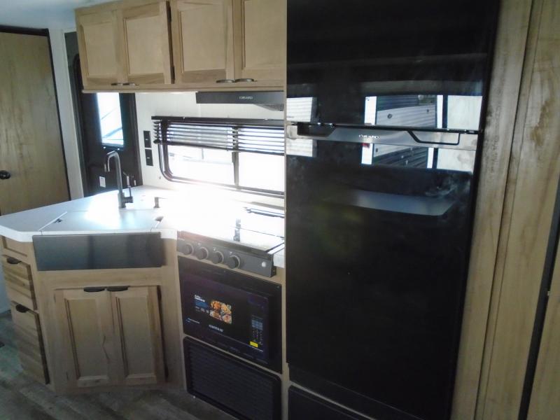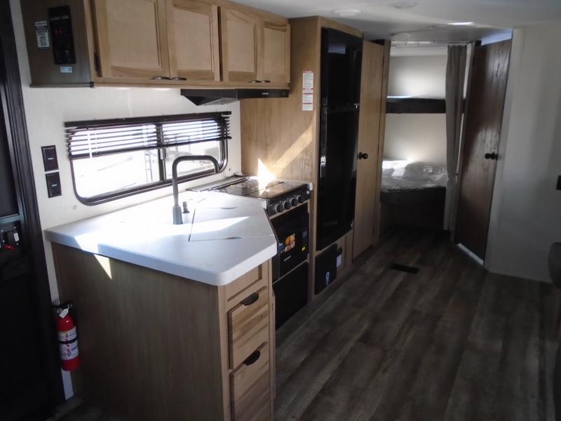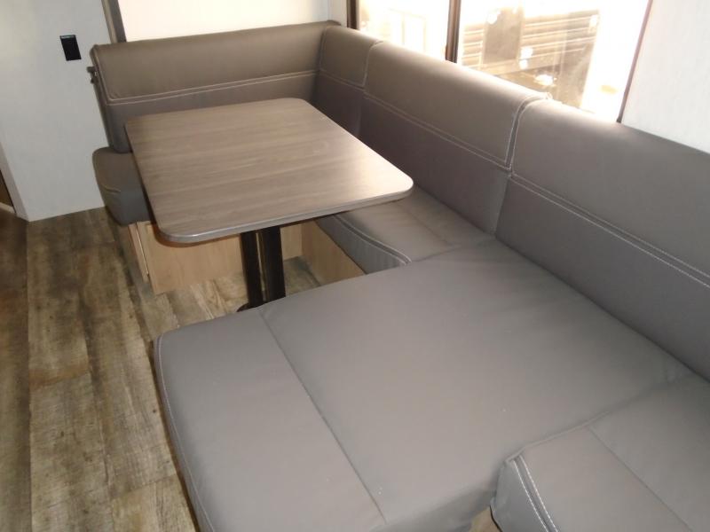 Have you been searching for a travel trailer with more interior space and a larger sleeping capacity? If so, this unit will be just right for you! The kids or your guests will love climbing in to double-size bunks each day, and you'll have a walk-around queen bed in the front bedroom all to yourselves. If you have any other guests, they can sleep on the U-shaped dinette and sofa within the large slide out in the main living area once converted. The chef of your group can whip up their best meals on the cooktop, and there is an air fryer to heat up any leftovers. You'll find storage space throughout this model including, an entryway coat closet, dual bedroom wardrobes, overhead cabinets, plus outside storage for camp chairs, tools, and more!