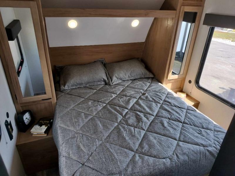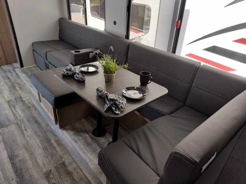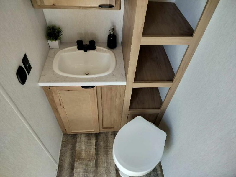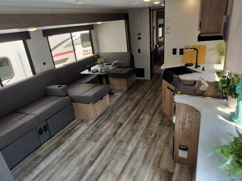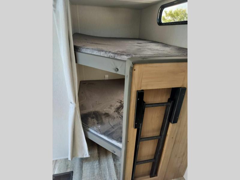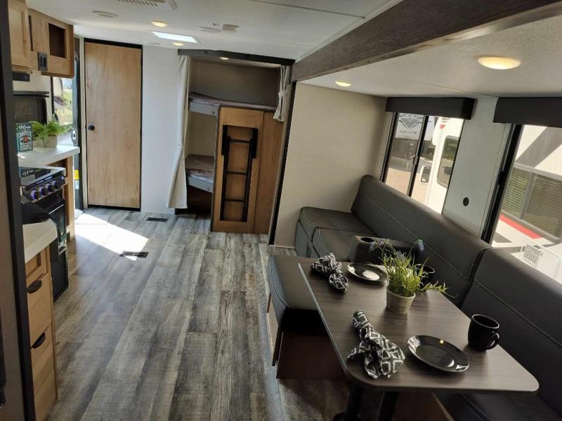 Camping with a large group has never been easier than with this travel trailer! You can easily sleep nine people each night thanks to the added double-size bunks, and your guests will even have their own half bath for convenience at night. The full walk-through bath includes a tub/shower, linen closet, plus a medicine cabinet to keep things tidy. You'll be met with a queen bed each night in the front private bedroom, and any other guests can sleep on the sofa or U-shaped dinette within the large slide out! A full kitchen in this model will let you prepare home-cooked meals inside when you don't feel like cooking over the campfire, and there is a pantry to keep snacks stocked up!