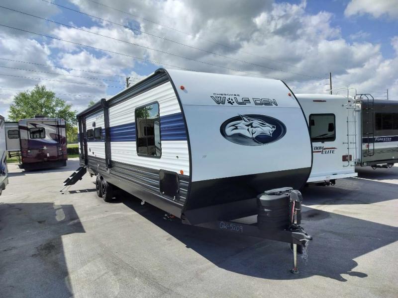 The Cherokee Wolf Den travel trailers by Forest River are lightweight for easy towing, while still including the camping essentials you're looking for! There are a variety of floorplans to choose from, including bunkhouse models, couple's units, and even all-electric floorplans! You'll find a tub/shower in each travel trailer, a comfortable queen bed, seating spaces to relax on, and kitchen amenities that will make your space feel more like home. There are storage spaces inside for your belongings plus outdoor storage for fishing gear, camp chairs, tools, and more! Start a new adventure today in a Cherokee Wolf Den travel trailer today!