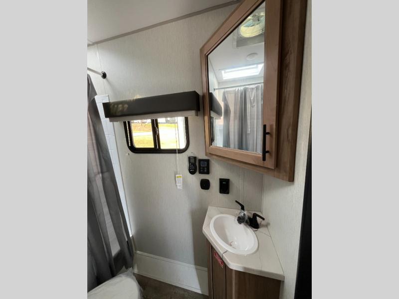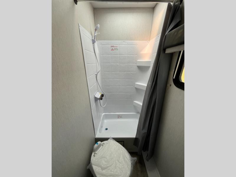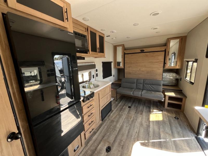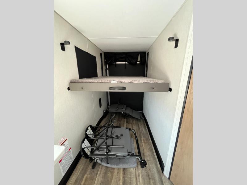 This toy hauler is sure to bring about great camping memories! There is 17' of total garage space to store your bikes, kayaks, and more! The 52" x 74" manual bunk bed can be brought down for your guests to sleep on, and you can take the front flip-over sofa. The ramp door can become a patio deck, and there is even outdoor TV prep if you want to make this space more accommodating. A two burner cooktop and microwave oven will let you make meals each day, and the refrigerator can hold cold drinks, leftovers, and more. You will love dining at the flip-up table with two seats, or you can take your plate outdoors to sit under the 12' awning. And don't overlook the full bath that will let you freshen up each day!
