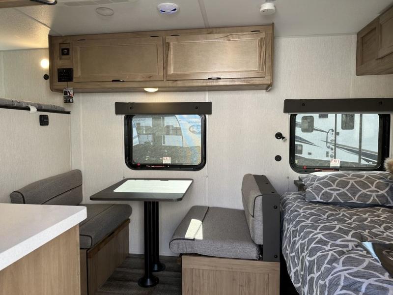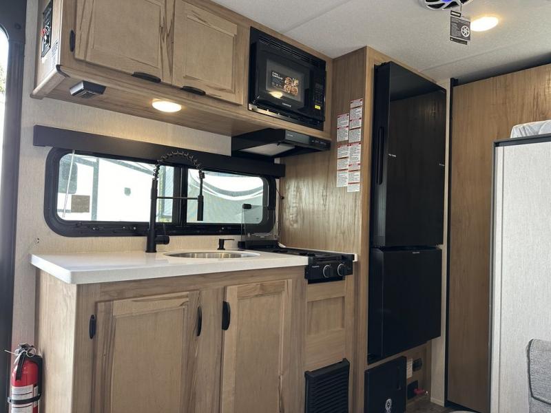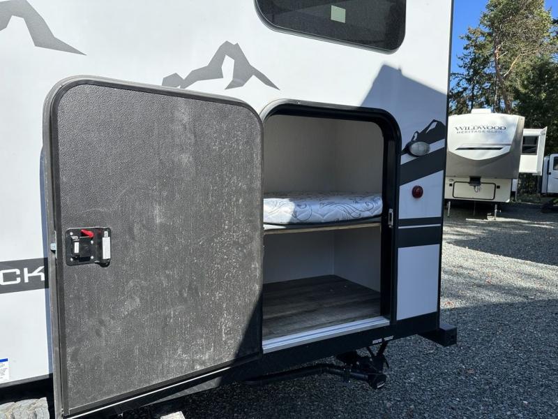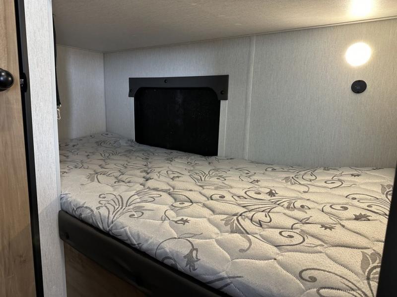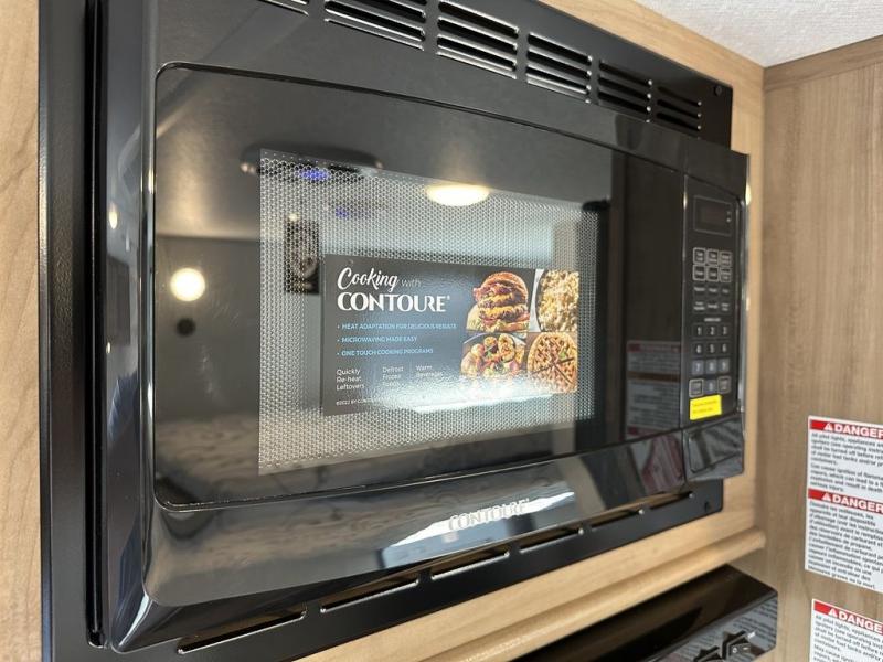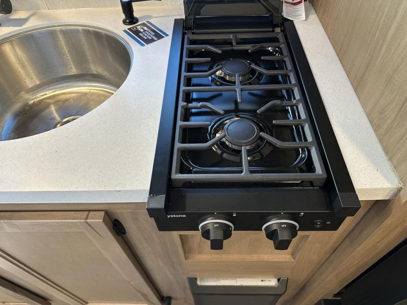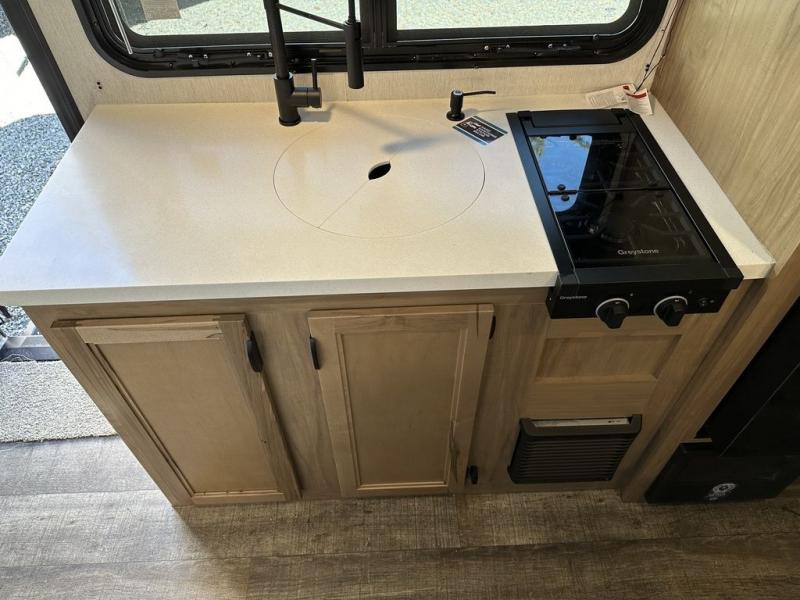 The whole family can sleep comfortably in this travel trailer! It has a set of bunk beds for the kids or guests to sleep on, and you can sleep comfortably on the front queen bed with overhead cabinets and a shelf. There is even an exterior storage plus door that accesses the storage space under the bottom bunk. The chef will enjoy preparing their best home cooked meals either indoors with the high output cooktop or at the outside mini kitchen while staying protected by the 12' power awning!