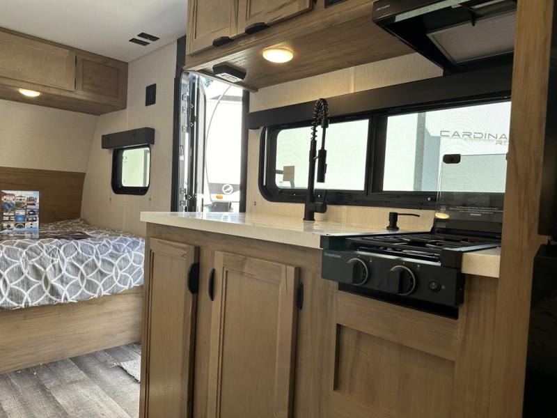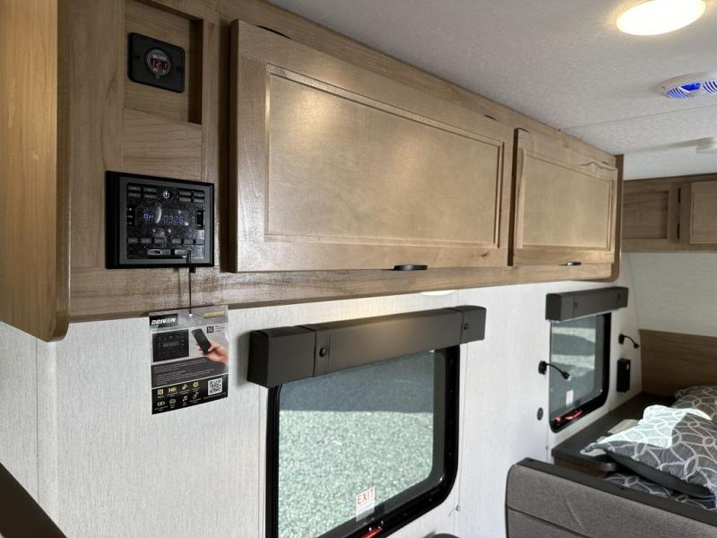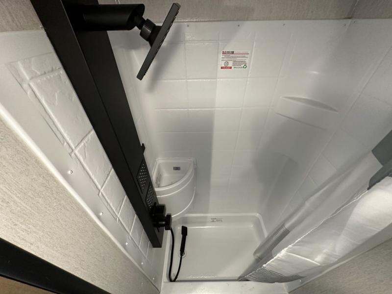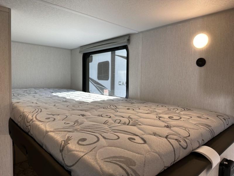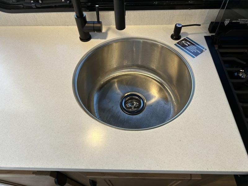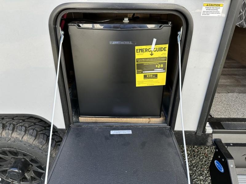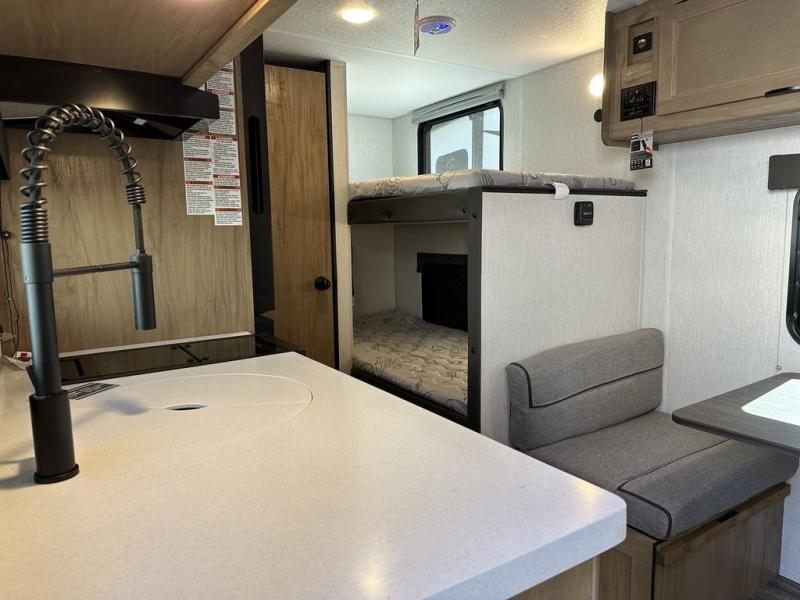 The whole family can sleep comfortably in this travel trailer! It has a set of bunk beds for the kids or guests to sleep on, and you can sleep comfortably on the front queen bed with overhead cabinets and a shelf. There is even an exterior storage plus door that accesses the storage space under the bottom bunk. The chef will enjoy preparing their best home cooked meals either indoors with the high output cooktop or at the outside mini kitchen while staying protected by the 12' power awning!