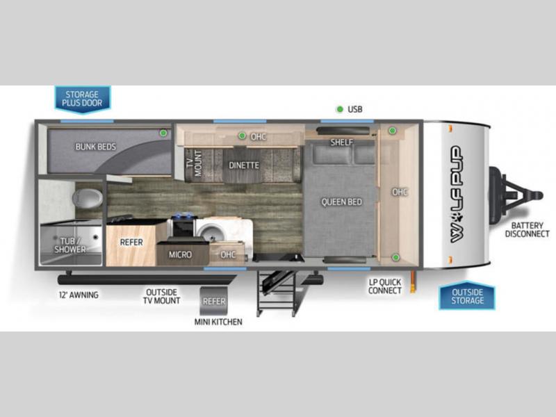 Each one of these Forest River Cherokee Wolf Pup Black Label travel trailers and toy haulers are lightweight and easy to tow! They are fully self contained with ample tank capacities, an abundance of storage space, and filled with at home amenities. Some features included with the Black Label Package that will set these models apart are the LG solid surface countertops, aluminum rims, designer fabrics, and upgraded bedspreads; see dealer for more details. The aerodynamic smooth radius front profile, Power Gear frame technology, and space saver rail design make them easier to maneuver. You will also appreciate the seamless roofing membrane with heat reflectivity to keep the sun from making your unit a hot box. The tongue and groove plywood flooring will hold up for years of fun and the USB charging stations help to keep your electronics at 100% while you're away. Come find the best model for you today!