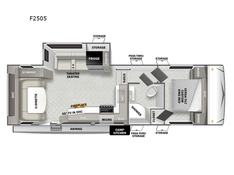 The Forest River EVO F2505 blends residential comfort, outdoor functionality, and high-quality construction, making it an excellent choice for those who want luxury and practicality in a fifth wheel.