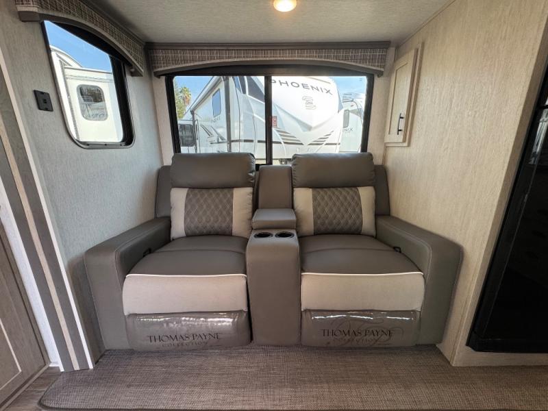 The rear U-shaped dinette doubles as guest sleeping space, while the theater seating offers a perfect view of the 55" LED Smart TV and fireplace.