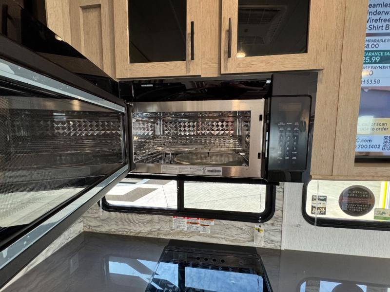 Enjoy solid surface counters, a 12V refrigerator, a large pantry, and residential appliances. For fresh-air cooking, use the outdoor kitchen—ideal for campsite barbecues.