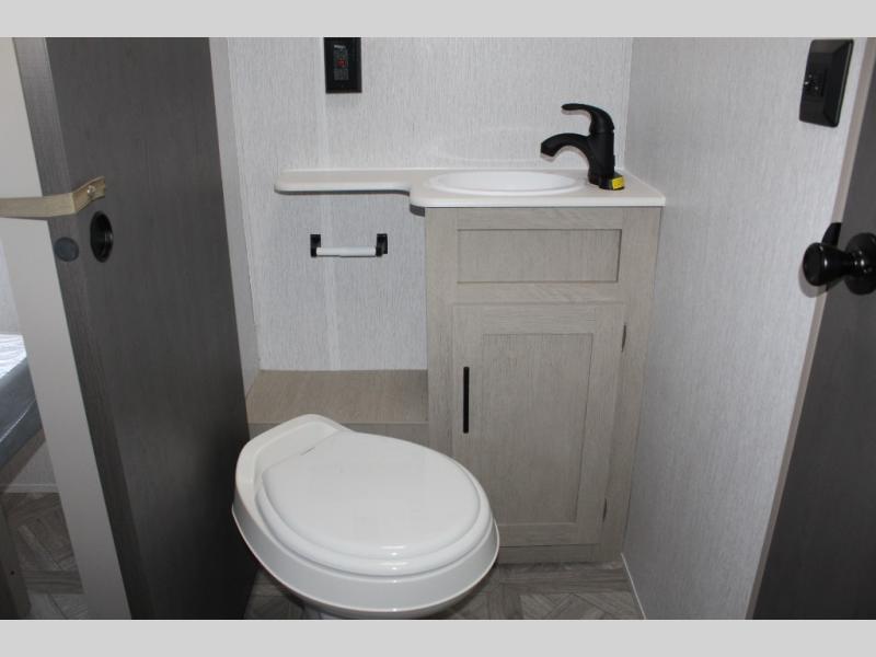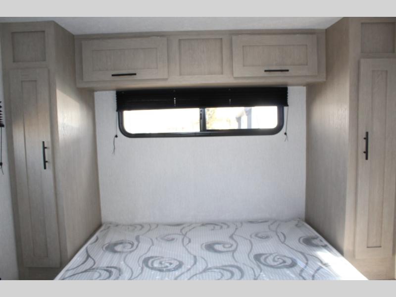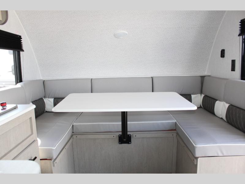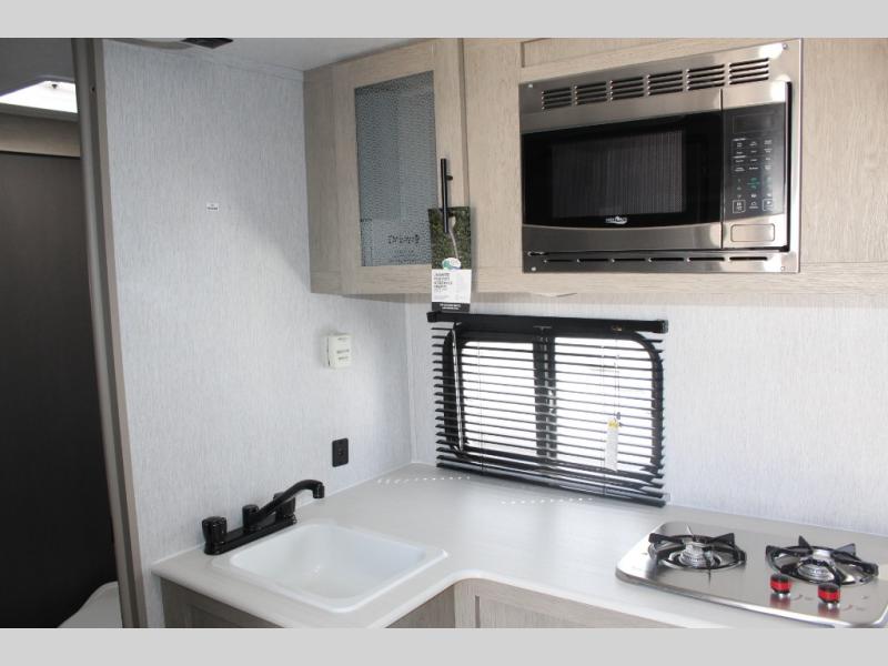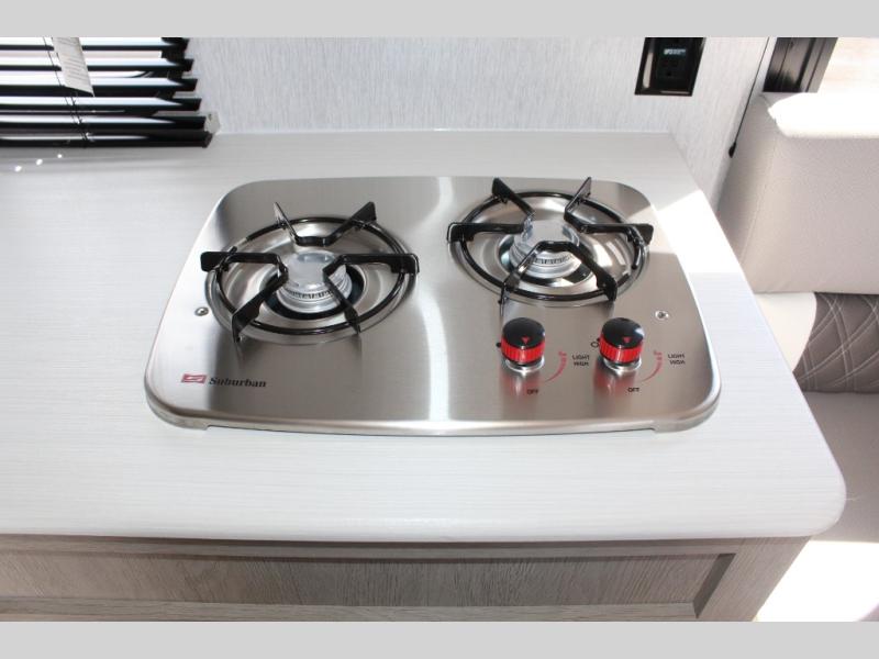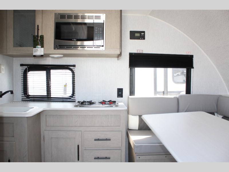 You and your spouse will enjoy escaping into the woods with this travel trailer! It features a rear bedroom with a queen bed that has wardrobes on either side to keep your clothes out of the way. With a walk-through bathroom, one person can freshen up in the shower while another washes up for dinner. Speaking of dinner you can prepare your best home cooked meals with the two burner cooktop and enjoy it at the front U-shaped dinette which can also transform into an extra sleeping space!