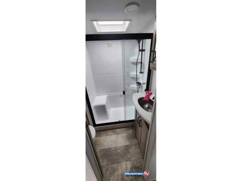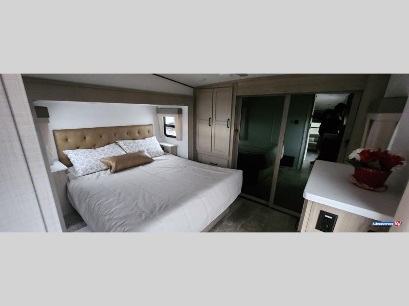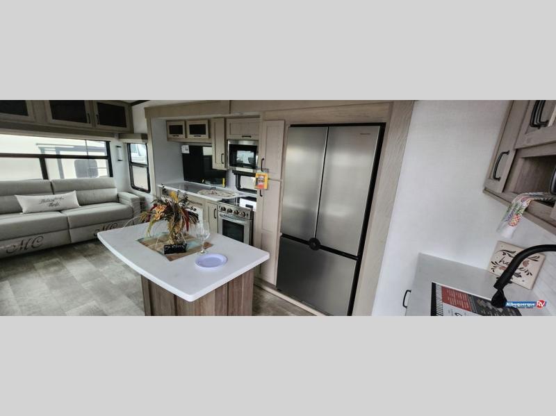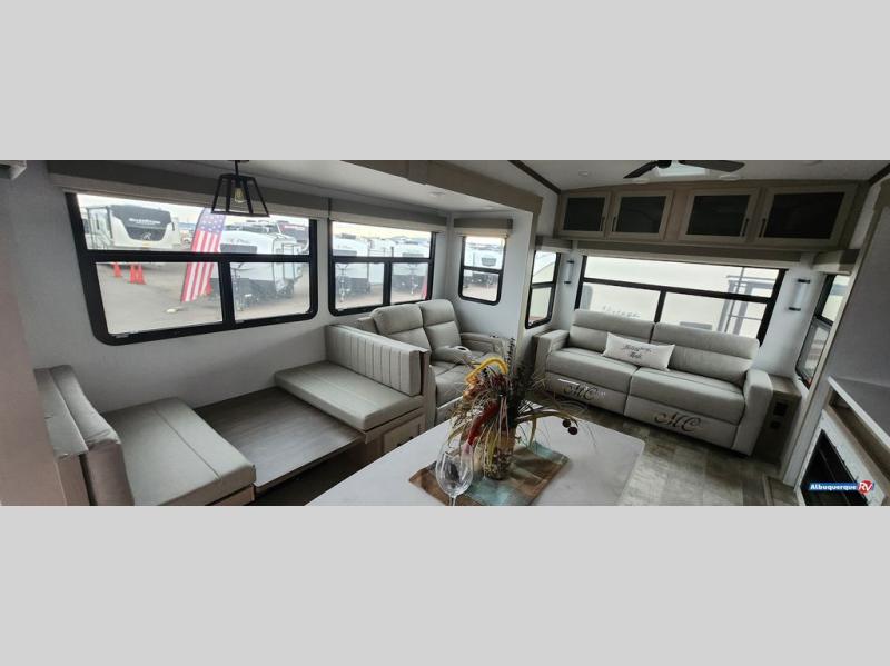 Get ready to enjoy the outdoors while inside with the enormous windows in both the rear and the door side slide of this fifth wheel. The spacious main living area offers dual opposing slides giving you a great place to invite other RVers over to visit, eat, and even play cards. There is seating for nine from the booth dinette, the theater seats, and the rear hide-a-bed sofa. The cook will have a large refrigerator to store lots of drinks and cold food, plus a pantry, and the center island offers extra counter space plus seating. After everyone has left, retire to the front bedroom with a queen bed slide, a shirt closet, a wardrobe with washer/dryer prep, plus more storage and a TV option. You might even like to choose a king bed option as well.