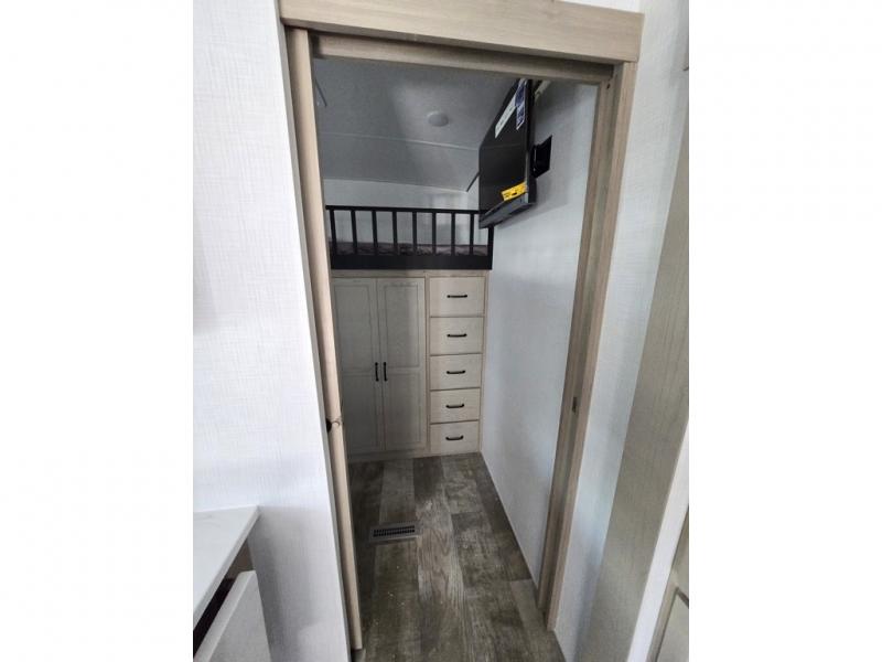 If you have a larger family or friend group this fifth wheel will allow you to bring everyone with sleeping space for ten or eleven campers. The kids or your guests will have privacy in the rear bunkhouse which offers a single 32" top bunk, and a set of 42" x 72" bunks, plus storage and a TV option. There is even a space prepped for a washer/dryer option if you like to keep everyone clean while camping. You will have privacy on the opposite side of the RV in the front bedroom which offers a queen bed, a dresser, and a slide out wardrobe that stretchers into the double entry bathroom which creates linen storage. And don't forget about all the kitchen amenities and the living area furniture which includes a hide-a-bed sofa and a king U-shaped dinette, Smart TV and fireplace. Outside, you will find pass-through storage, a 20' awning creating an outdoor living space, plus an outside kitchen and griddle giving the cook more choices when making meals for everyone.